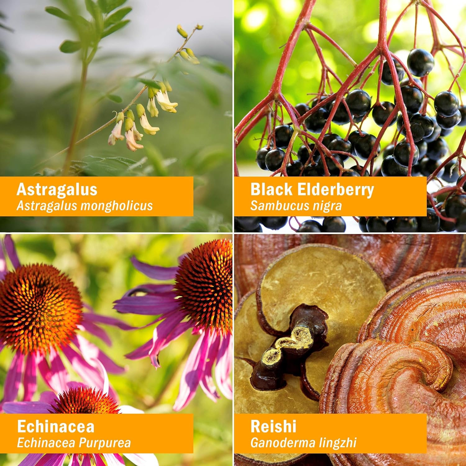 Astragalus, Cinnamon, Echinacea Root, Black Elderberry, Reishi, Distilled Water, Organic Vegetable Glycerin