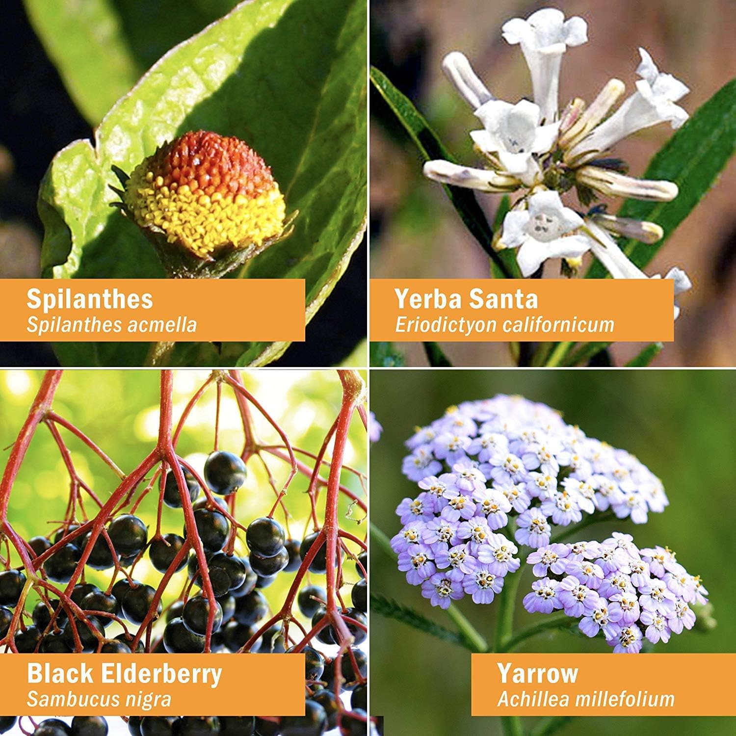 Black Elderberry, Echinacea, Ginger, Goldenseal, Horseradish, Elecampane, Spilanthes, Yarrow, Wild Indigo, Yerba Santa, Organic Cane Alcohol, Distilled Water, Organic Vegetable Glycerin