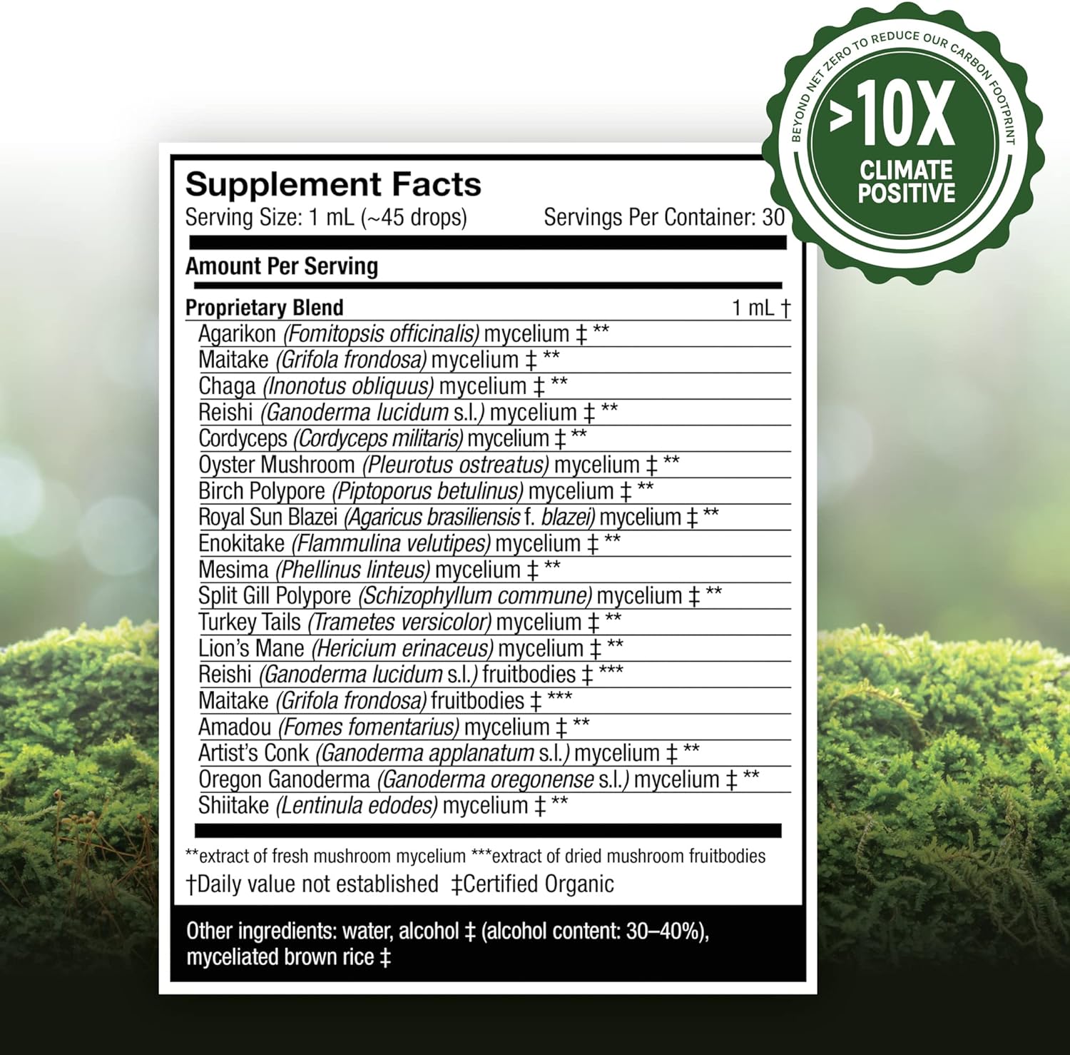 Agarikon mycelium, Maitake mycelium, Chaga mycelium, Reishi mycelim, Cordyceps mycelium, Zhu Ling mycelium, Birch Polypore mycelium, Royal Sun Blazei mycelium, Enokitake mycelium, Mesima mycelium, Split Gill Polypore mycelium, Turkey Tails mycelium, Lion's Mane mycelium, Reishi fruitbodies, Maitake fruitbodies, Amadou mycelium, Artist's Conk mycelium, Oregon Ganoderma mycelium, Shiitake mycelium, alcohol (alcohol content 30%-40%), myceliated brown rice