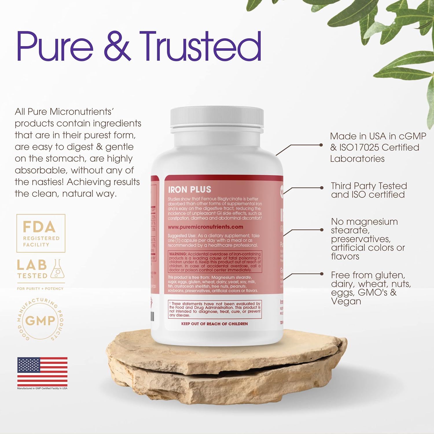 NATURAL, PURE & TRUSTED – Iron Plus contain only pure ingredients; gmo free, no magnesium stearate, preservatives or other non-active ingredients - so you can reap the benefits, without any of the Nasties. Made with Kosher & Halal ingredients. VEGAN FRIENDLY. #1 Pharmaceutical Grade, USA MADE, Third Party Tested with a 100% Lifetime Satisfaction Guarantee.