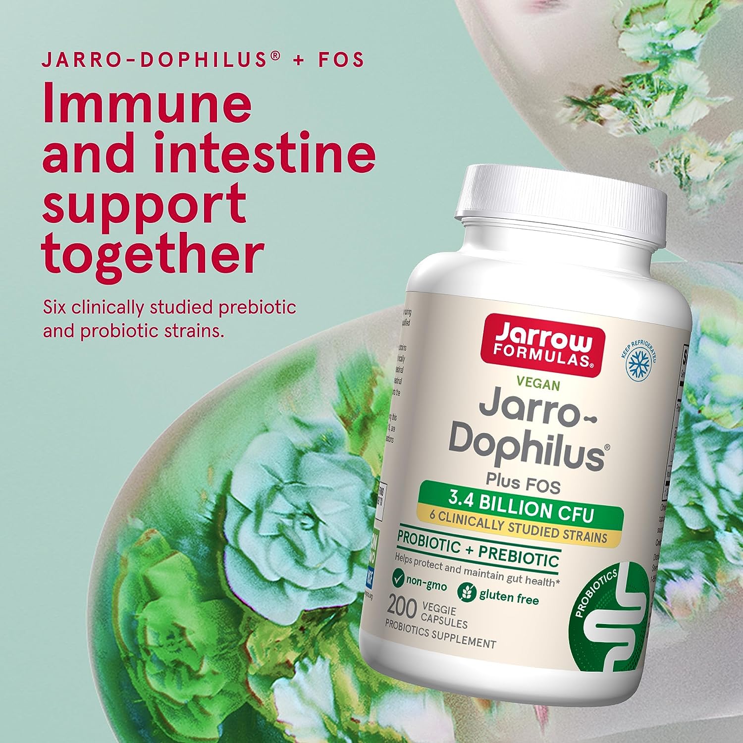 Jarrow Formulas Jarro-Dophilus + FOS is synbiotic (probiotic + prebiotic) with six documented strains, including B. longum BB536. Formulated with inulin-fructooligosaccharides (FOS) for added nutritional support to beneficial bacteria. The formula contains strains to protect & maintain a balanced intestinal microflora, and support immune function & intestinal health.* Delivers a minimum of 3.4 billion viable cells at time of consumption (under recommended storage conditions, and within Best Used Before date).
