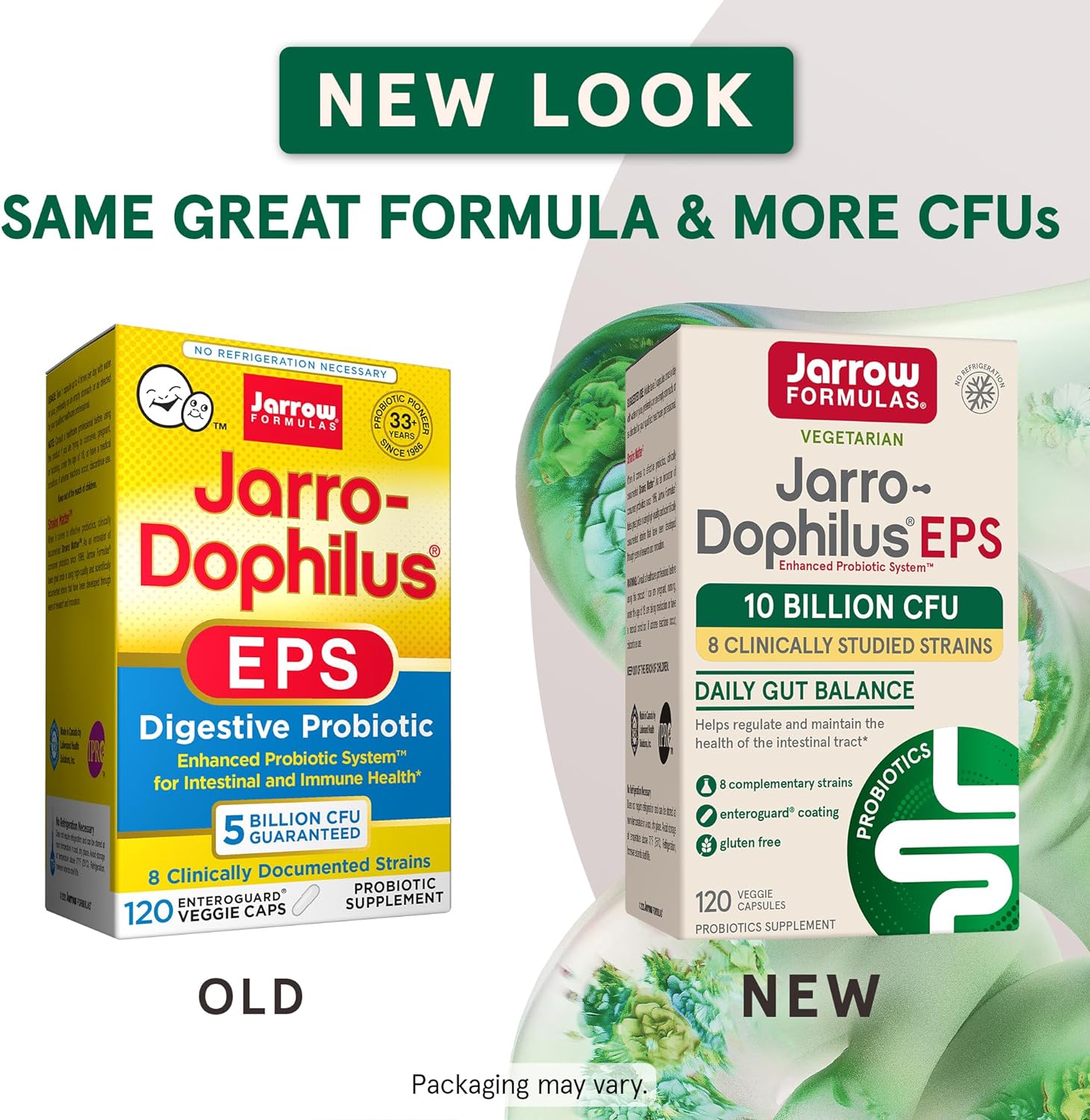 - Jarrow Formulas Jarro-Dophilus EPS Probiotic Capsules provide a carefully selected mixture of probiotic strains to maintain gut balance and support intestinal tract health.* Made with high-quality, non-GMO ingredients, this vegetarian and gluten free dietary supplement contains no wheat, egg, fish, shellfish, peanuts, tree nuts, or sesame. A great choice for people seeking to support their intestinal tract, each Jarro-Dophilus EPS serving delivers 10 billion organisms from eight clinically-studied strains directly into the small intestine to help maintain and regulate gut health.* These strains include Lactobacillus rhamnosus R0011 which facilitates colonization and stimulates intestinal immune response, Bifidobacteria longum BB536 which promotes the growth of beneficial bacteria, and Lactobacillus helveticus R0052 which assists in breaking down lactose and may be helpful for those with lactose intolerance.* Each capsule is blister-packed to protect from moisture and features the proprietary Enteroguard coating to protect the probiotics from stomach acid. Suggested Use: Adults, take two capsules once a day with water or juice and preferably on an empty stomach, or as directed by your qualified healthcare professional. Informed by strong scientific research, Jarrow Formulas products are carefully crafted to ensure you get the benefit of each and every vitamin, mineral and supplement.
