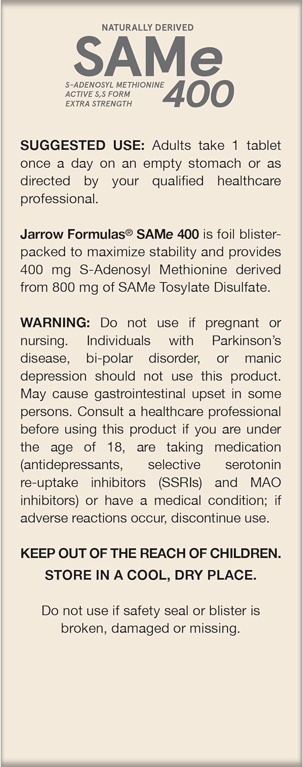 Jarrow Formulas SAMe provides SAM-e (S-Adenosyl Methionine), a naturally derived compound that plays a role in supporting various biochemical systems in the body.* Each tablet of Jarrow Formulas SAM-e provides 400 mg of SAM-e to provide benefits. Jarrow Formulas SAM-e offers a wide array of benefits that can support various aspects of your health and well-being.* SAM-e supports joint health, and liver function.* Jarrow Formulas SAM-e is non-GMO, vegan-friendly, and gluten free, making it an ideal choice for those with dietary restrictions.* These tablets are also wheat free, soy free, dairy free, egg free, fish/shellfish free, peanut/nut free, and sesame free.* Taking Jarrow Formulas SAM-e is simple and convenient. Adults should take 1 tablet per day on an empty stomach or as directed by your qualified healthcare professional.* At Jarrow Formulas, we aren't your typical vitamin company. We believe everyone has the right to feel good in their own body. Jarrow Formulas original goal has always remained the same: To design superior dietary supplements that help empower individuals to take charge of their own health.*These statements have not been evaluated by the Food and Drug Administration. This product is not intended to diagnose, treat, cure or prevent any disease.