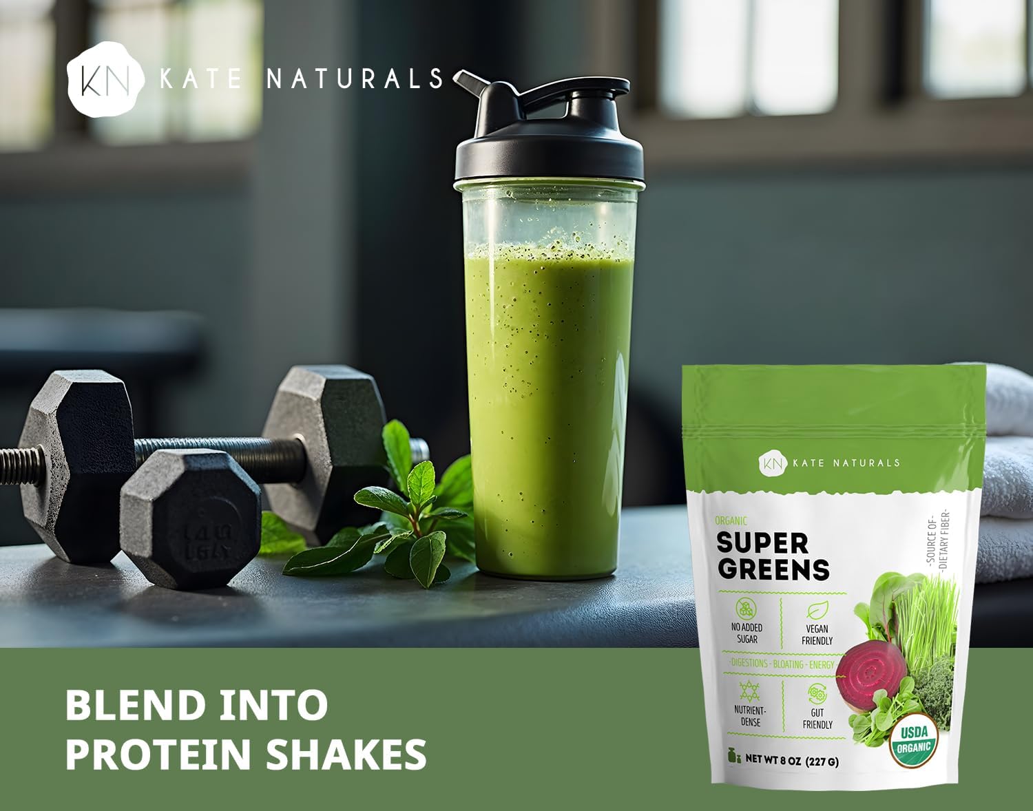 - PLANT-BASED NUTRIENT SUPPORT: Kate Naturals' Organic Super Greens Blend is made with a variety of nutrient-rich organic ingredients that are naturally dense in vitamins, minerals, and antioxidants.