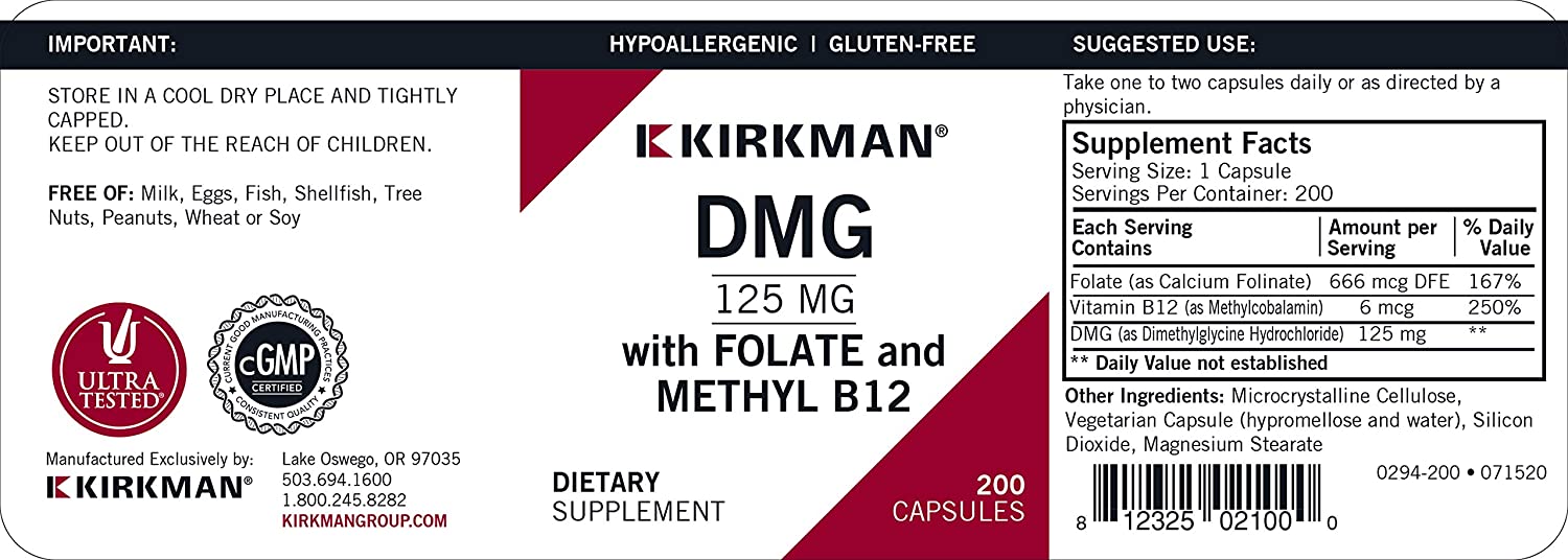 Kirkman DMG 125 mg with Folate and Methyl B12 200 Capsules