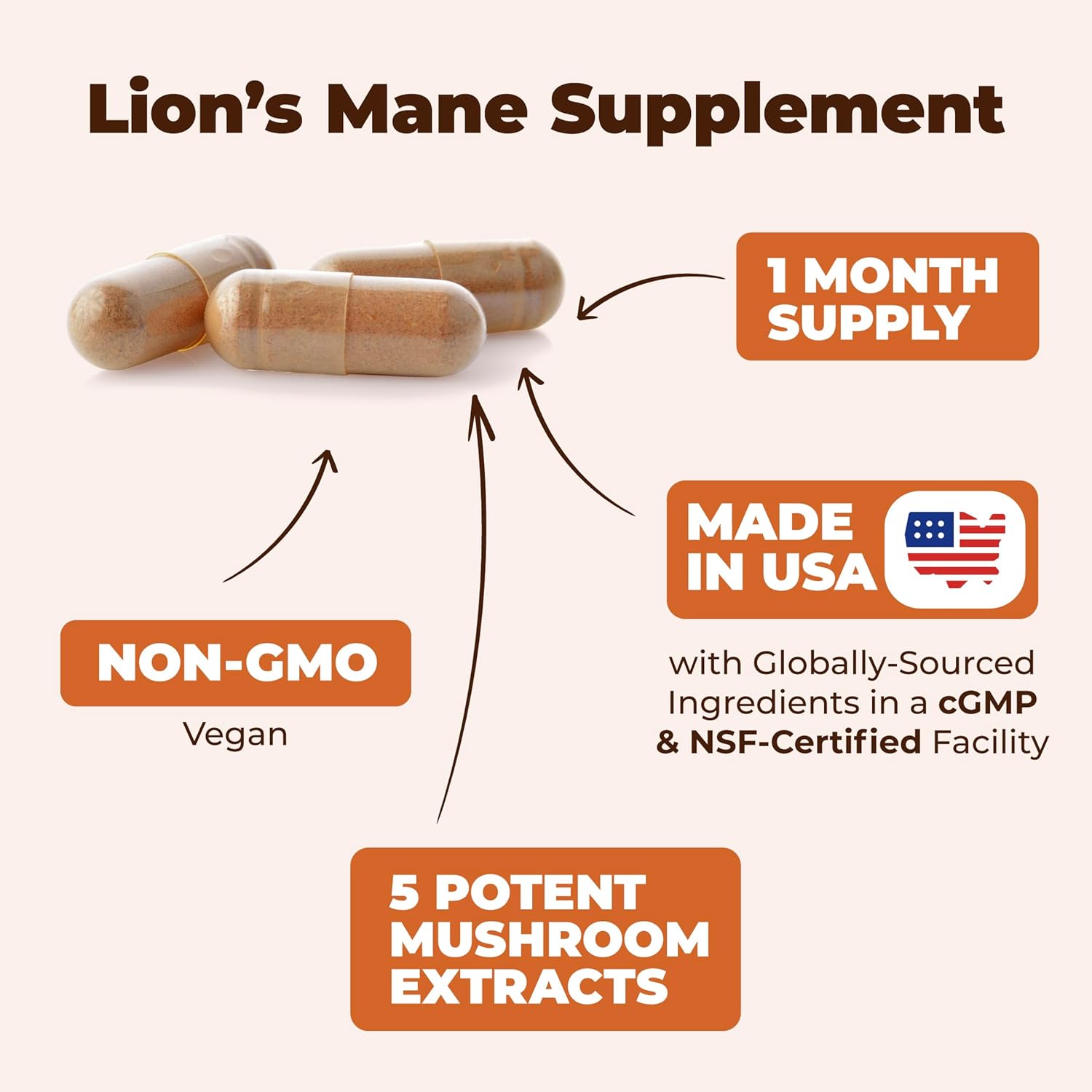 - PREMIUM MUSHROOM COMPLEX CAPSULES YOU CAN TRUST: Brain Supplements for Memory and Focus made in the USA in a cGMP-Certified & NSF-Certified Facility with Globally-Sourced ingredients. Non-GMO. Vegan and Vegetarian. Convenient flip-top bottle.