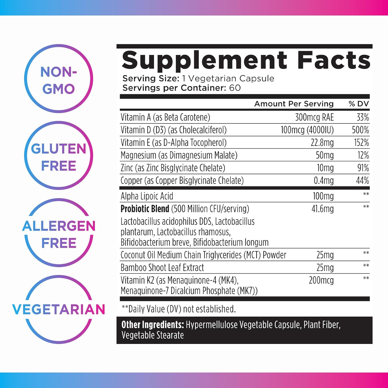 Vitamin A (as Beta Carotene), Vitamin D3 (as Cholecalciferol), Vitamin E (as D-Alpha Tocopherol), Copper (as Copper Bisglycinate Chelate), Magnesium (as Dimagnesium Malate), Zinc (as Zinc Bisglycinate Chelate), Alpha Lipoic Acid, Organic Coconut MCT Oil Powder, Vitamin K2 (as MK4 and MK7), ๐ฃ๐ฟ๐ผ๐ฏ๐ถ๐ผ๐๐ถ๐ฐ ๐๐น๐ฒ๐ป๐ฑ (๐ฑ๐ฌ๐ฌ ๐ ๐ถ๐น๐น๐ถ๐ผ๐ป ๐๐๐จ/๐๐ฒ๐ฟ๐๐ถ๐ป๐ด): Lactobacillus acidophilus DDS, L. plantarum, L. rhamnosus, B. breve, B. longum --- ๐ข๐๐ต๐ฒ๐ฟ ๐๐ป๐ด๐ฟ๐ฒ๐ฑ๐ถ๐ฒ๐ป๐๐: Vegetable Capsule, Plant Fiber, Vegetable Stearate