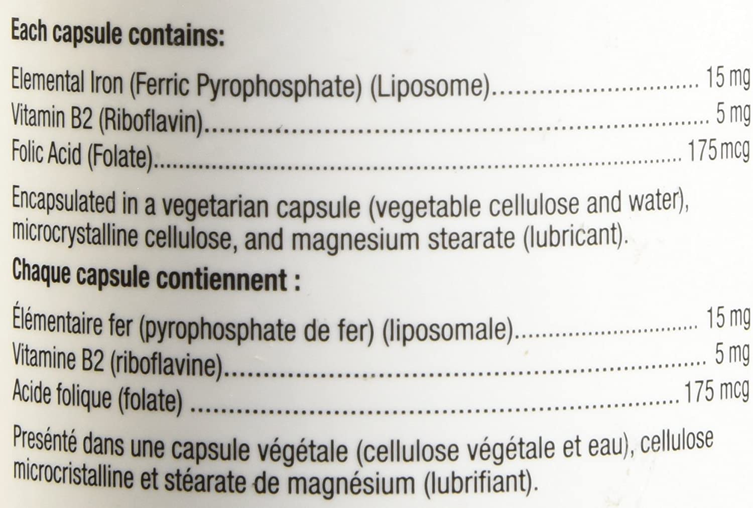 Ingredients : EACH CAPSULE CONTAINS : Elemental Iron (Iron pyrophosphate, Lipsome) 15 mg Vitamin B2 (Riboflavin) 5 mg Folic Acid (Folate) 175 mcg This product does not contain artificial preservatives, colours or sweeteners; no corn, dairy, soy, wheat, gluten or yeast. GLUTEN-FREE.