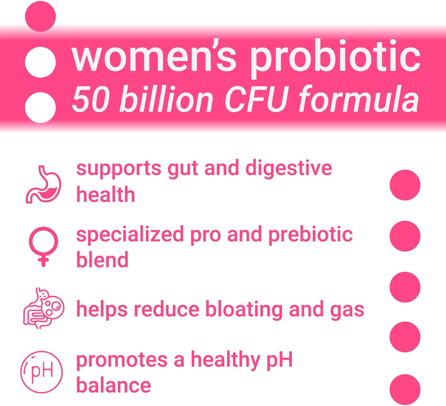- Premium Probiotic for Women - Specially formulated for feminine health and total digestive health. Our formular contains 50 Billion CFU of high quality probiotics, and also includes powerful prebiotics.