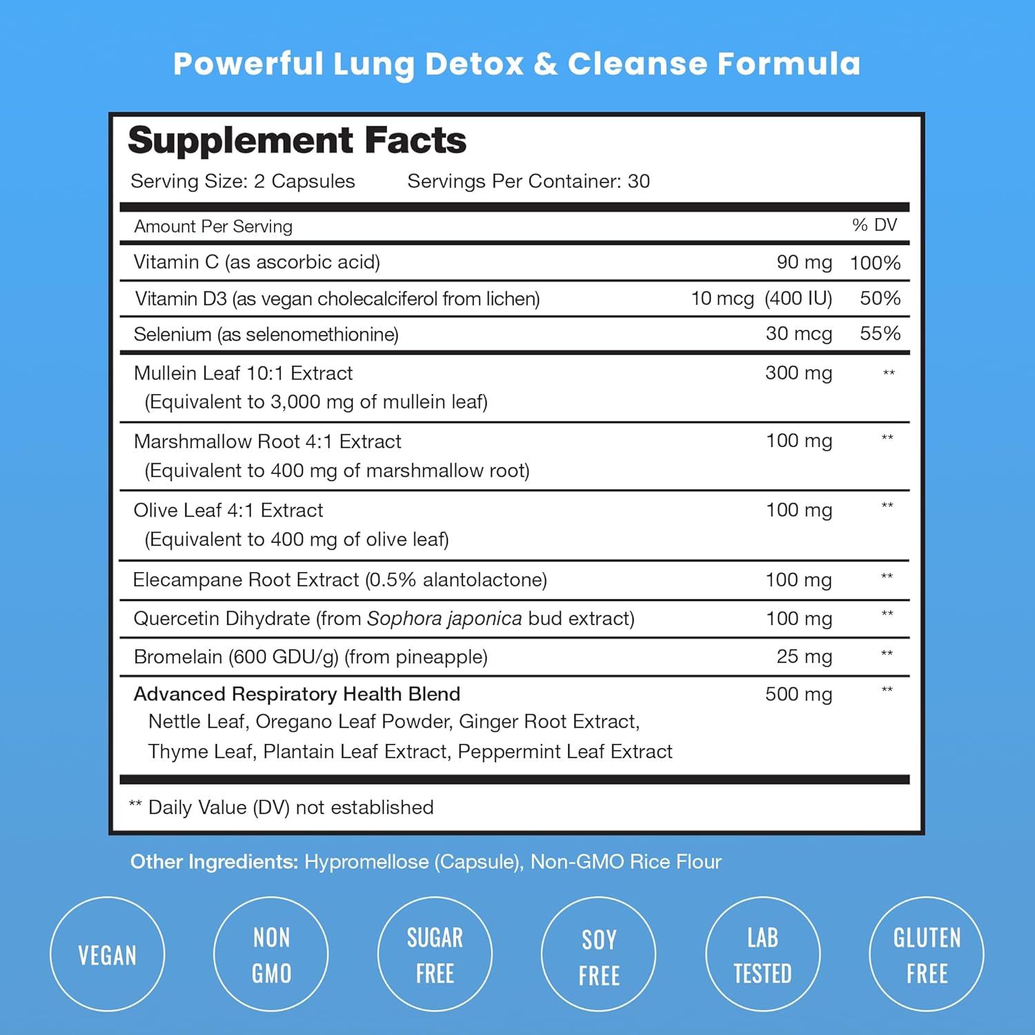- 15-in-1 Lung Detox Formula - We’ve combined nature’s best ingredients to address all areas of lung health; from detoxification & cleansing, to comfortable breathing & daily support. Made with key ingredients Mullein Leaf, Selenium, Bromelain & more!