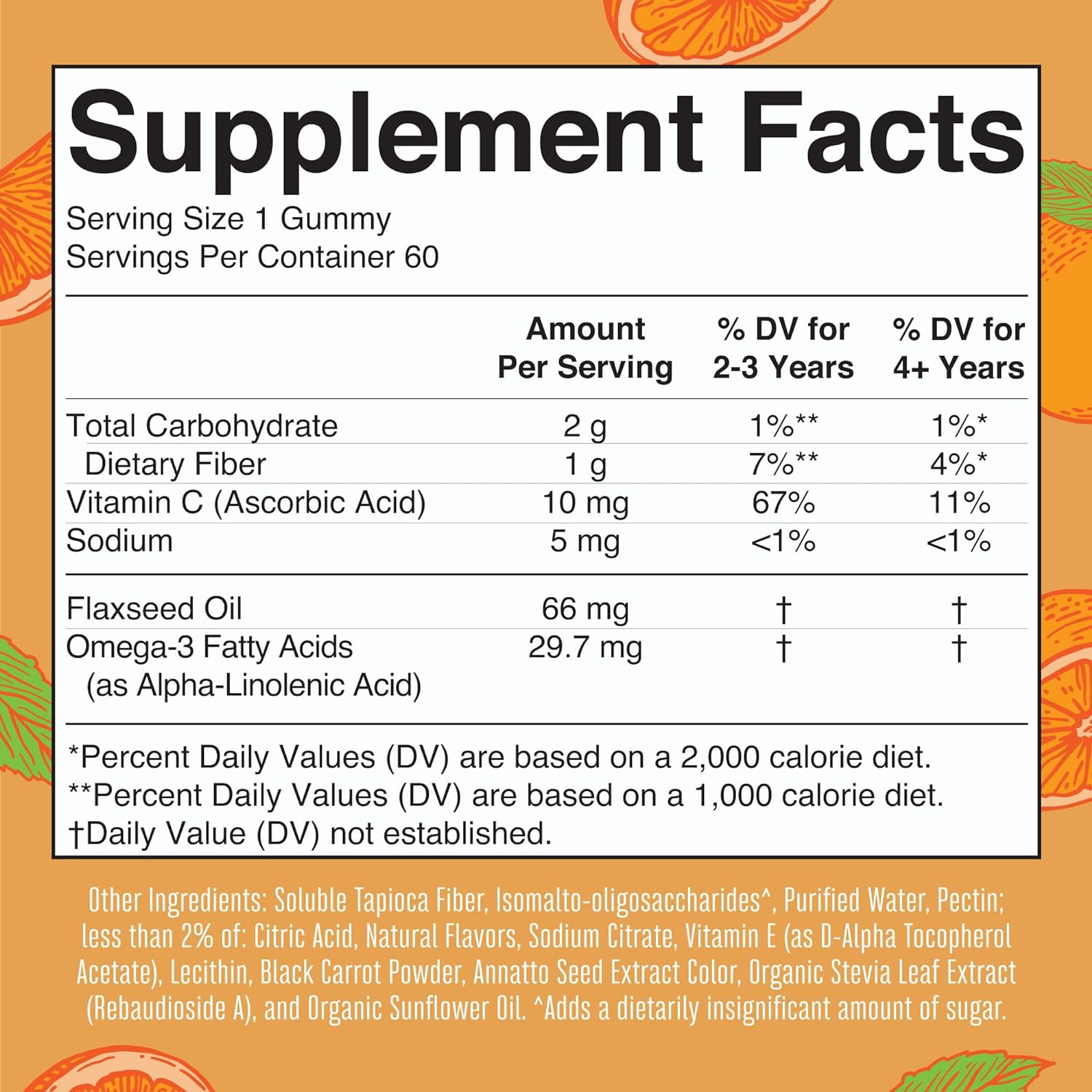 - Vegan Formula: Vitamin C (Ascorbic Acid) | Vitamin E (as d-alpha Tocopherol Acetate) | Sodium | Flaxseed Oil | Omega 3 Fatty Acids (as Alpha Linolenic Acid). Other Ingredients: Soluble Tapioca Fiber | Isomalto-oligosaccharides^ | Purified Water | Pectin; less than 2% of: Citric Acid | Natural Flavors | Sodium Citrate | Lecithin | Black Carrot Color | Annatto Extract Color | Organic Stevia Leaf Extract | Organic Sunflower Oil.