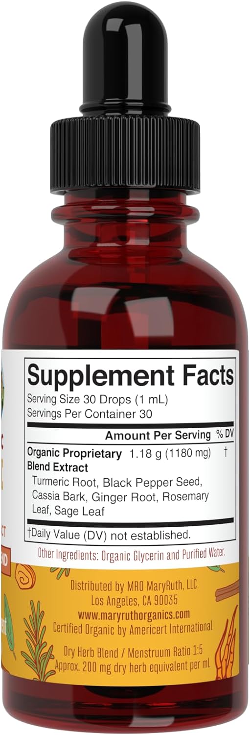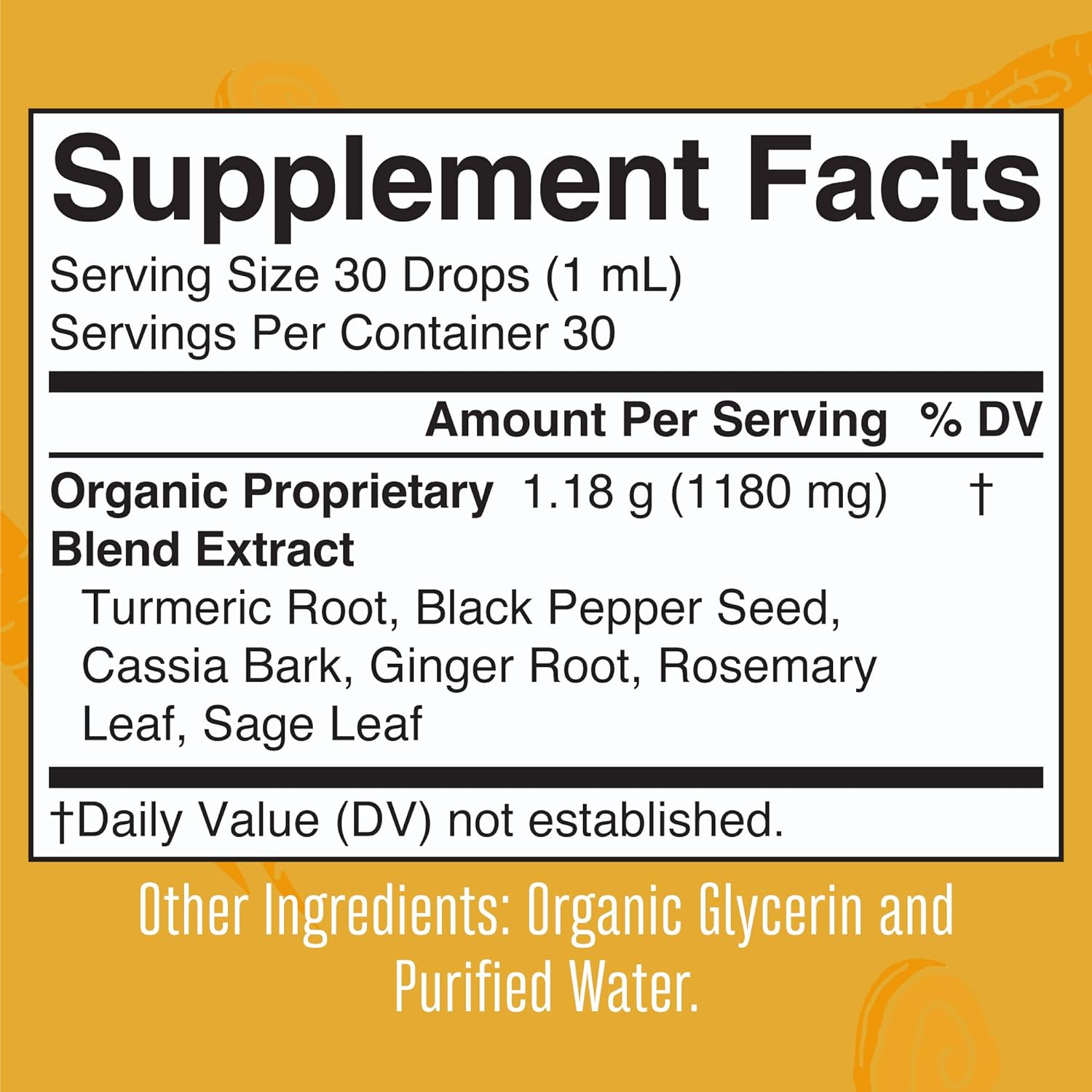 - Vegan Formula: Per Serving (1 mL): Organic Proprietary Blend of Turmeric (Curcuma longa) Root | Black Pepper (Piper nigrum) Seed | Cinnamon (Cassia) (Cinnamomum cassia) Bark | Ginger (Zingiber officinale) Root | Rosemary (Rosmarinus officinalis) Leaf | Sage (Salvia officinalis) Leaf. Other Ingredients: Organic Glycerin and Purified Water.