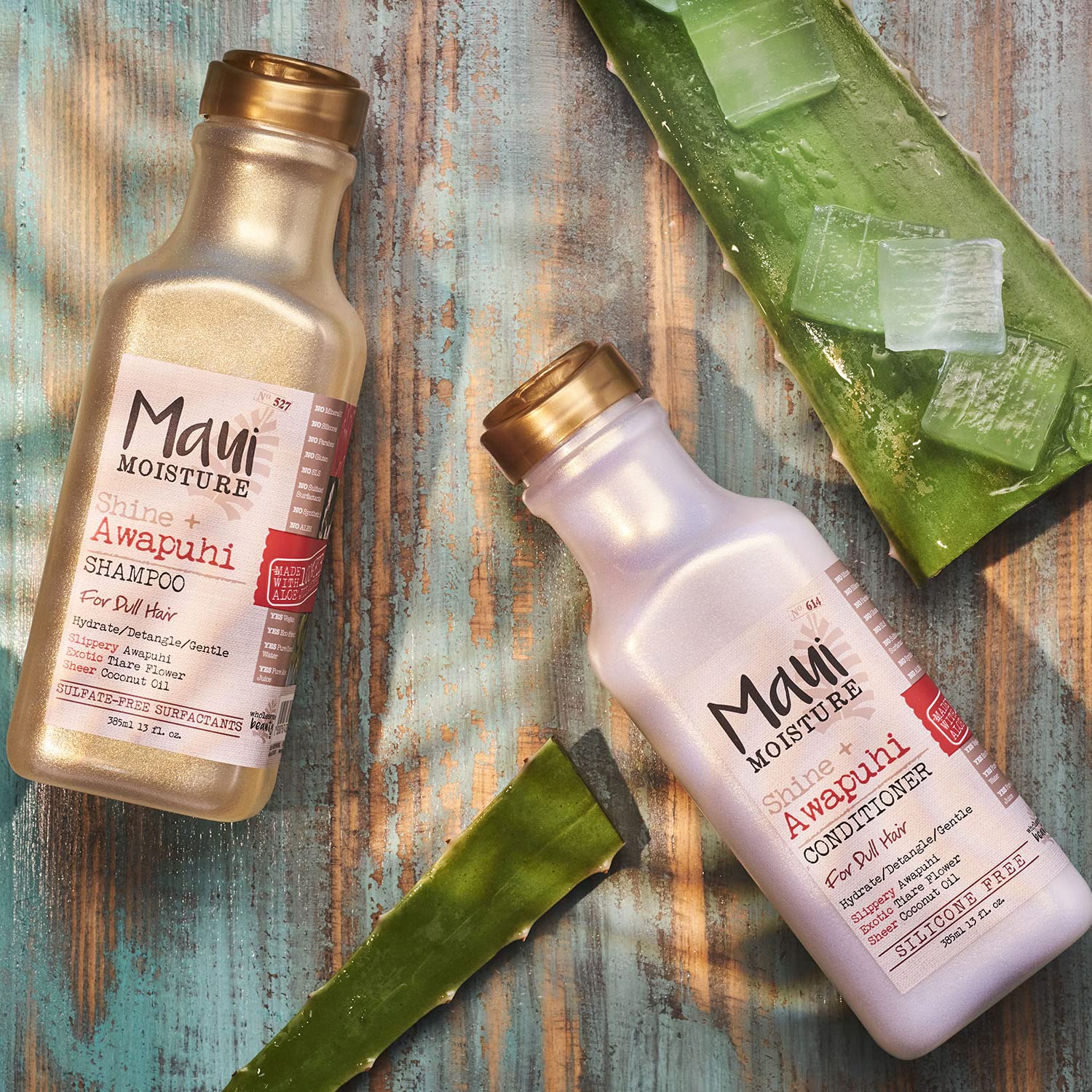 - Lightweight Hydration. Condition dry, dull hair to a radiant shine with the nourishment it craves. With 100% aloe vera as the base ingredient, Maui Moisture Shine + Awapuhi Conditioner blends pure coconut water and tropical flower extract for a luxurious tropical experience.