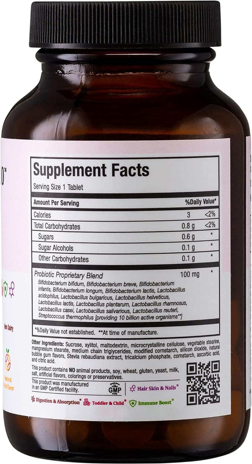 Serving Size: 1 Tablet •• Calories 3 • Total Carbohydrates 0.8 g• Added Sugars 0.6 g • Sugar Alcohols 0.1 g • Other Carbohydrates 0.1 g• •Probiotic Proprietary Blend:Bifidobacterium bifidum, Bifidobacterium breve, Bifidobacterium infantis, Bifidobacterium longum, Bifidobacterium lactis, Lactobacillus acidophilus, Lactobacillus bulgaricus, Lactobacillus helveticus, Lactobacillus lactis, Lactobacillus plantarum, Lactobacillus rhamnosus, Lactobacillus casei, Lactobacillus salivarious, Lactobacillus reuteri, Streptococcus thermophilus [providing 10 billion active organisms (at time of manufacture)] 100 mg •• Other Ingredients: Sucrose, xylitol, maltodextrin, microcrystalline cellulose, vegetable stearine, magnesium stearate, medium chain triglycerides, modified cornstarch, silicon dioxide, natural bubble gum flavors, Stevia rebaudiana extract, tricalcium phosphate, cornstarch, ascorbic acid, and citric acid.•• This product contains NO animal products, soy, wheat, gluten, yeast, milk, salt, artificial flavors, colorings or preservatives.