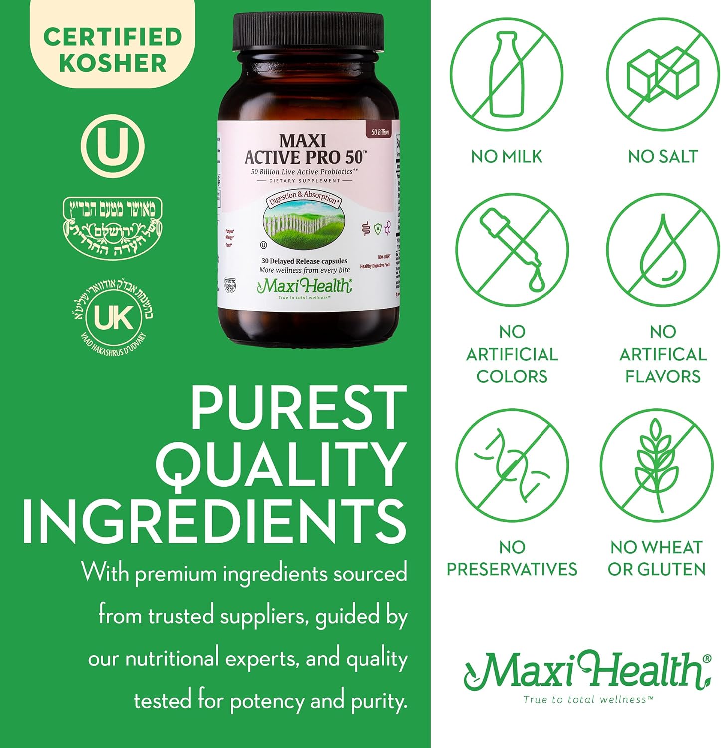 - ALL NATURAL, VEGETARIAN, DAIRY FREE & KOSHER CERTIFIED - Maxi Health is the leader in kosher supplements with over 250 products. Manufactured in a GMP Certified facility that has been providing families the high-quality health products they need for over 40 years. We are dedicated to only using natural, kosher ingredients and producing our supplements in the USA.