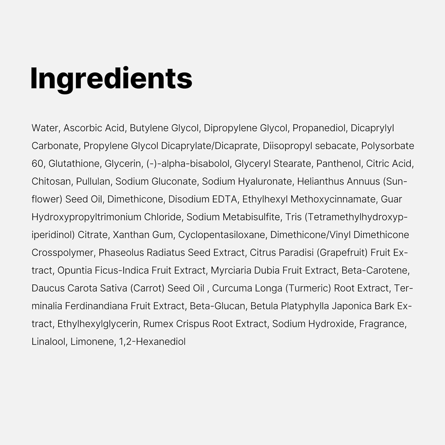 Water, Ascorbic Acid, Butylene Glycol, Dipropylene Glycol, Propanediol, Dicaprylyl Carbonate, Propylene Glycol Dicaprylate/Dicaprate, Diisopropyl sebacate, Polysorbate 60, Glutathione, Glycerin, (-)-alpha-bisabolol, Glyceryl Stearate, Panthenol, Citric Acid, Chitosan, Pullulan, Sodium Gluconate, Sodium Hyaluronate, Helianthus Annuus (Sunflower) Seed Oil, Dimethicone, Disodium EDTA, Ethylhexyl Methoxycinnamate, Guar Hydroxypropyltrimonium Chloride, Sodium Metabisulfite, Tris (Tetramethylhydroxypiperidinol) Citrate, Xanthan Gum, Cyclopentasiloxane, Dimethicone/Vinyl Dimethicone Crosspolymer, Phaseolus Radiatus Seed Extract, Citrus Paradisi (Grapefruit) Fruit Extract, Opuntia Ficus-Indica Fruit Extract, Myrciaria Dubia Fruit Extract, Beta-Carotene, Daucus Carota Sativa (Carrot) Seed Oil , Curcuma Longa (Turmeric) Root Extract, Terminalia Ferdinandiana Fruit Extract, Beta-Glucan, Betula Platyphylla Japonica Bark Extract, Ethylhexylglycerin, Rumex Crispus Root Extract, Sodium Hydroxide, Fragrance, Linalool, Limonene, 1,2-Hexanediol