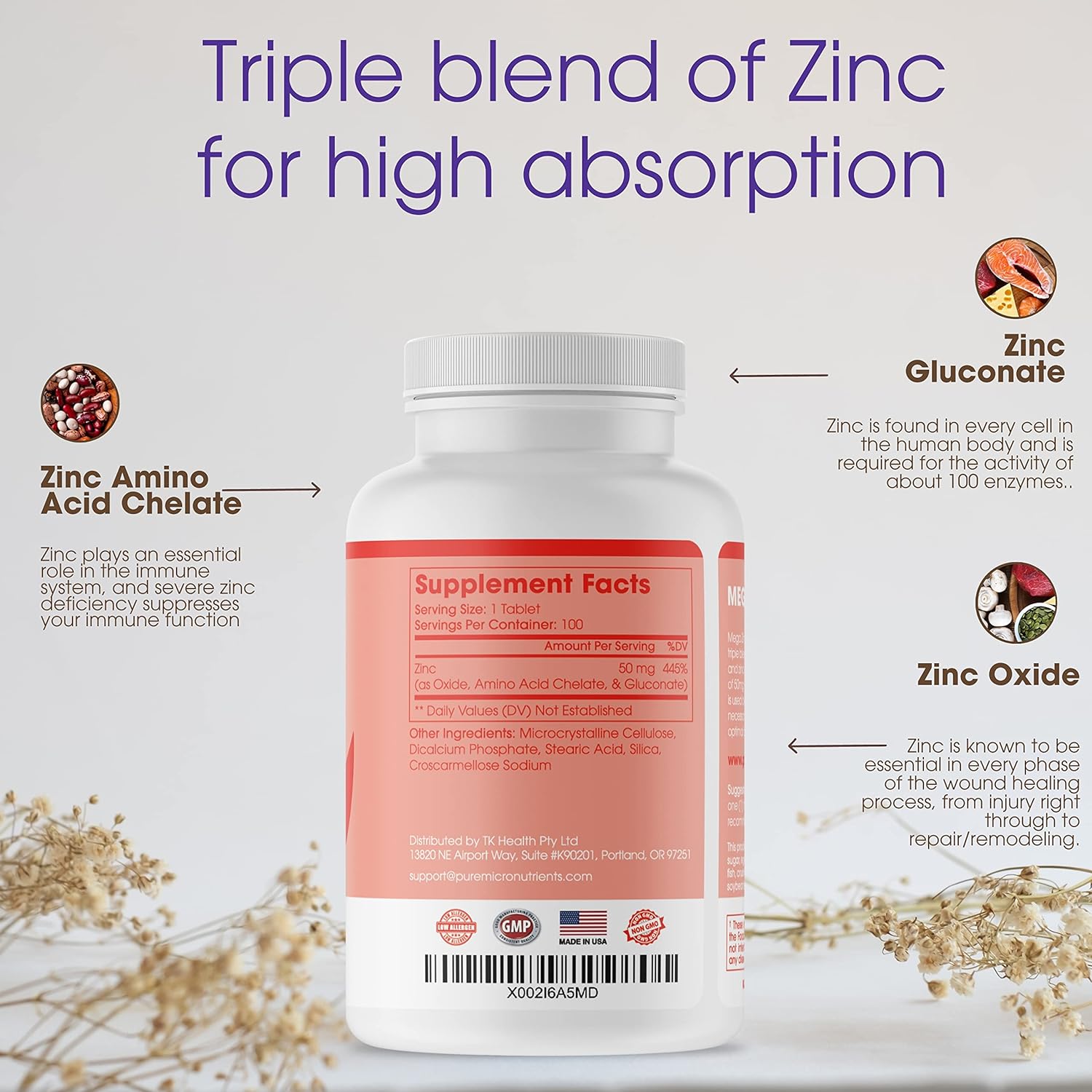 Mega Zinc Supplement, 50mg - 3-in-1 Zinc Complex - 100 Tablets