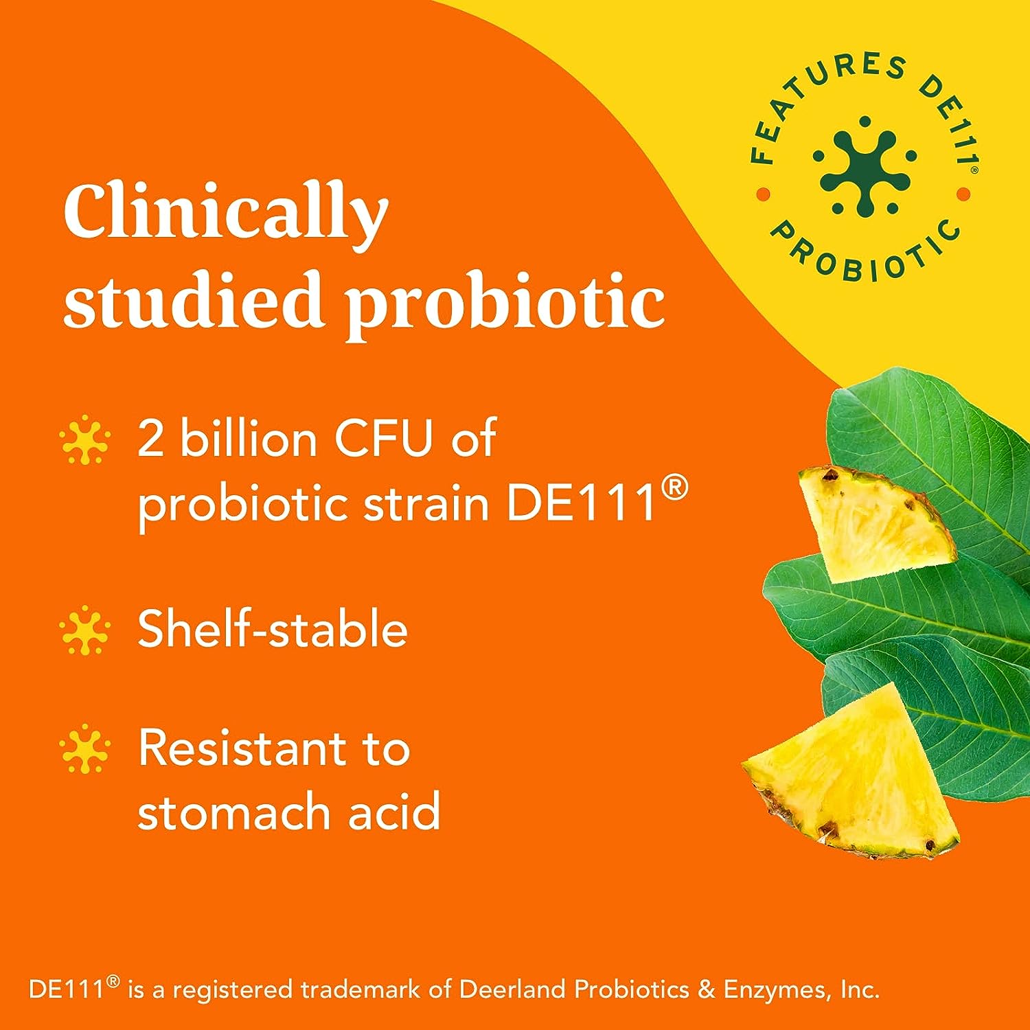 - Features DE111 Probiotic: DE111 is a probiotic strain clinically studied to be shelf-stable and resistant to stomach acid – so it can survive the journey and keep doing its job