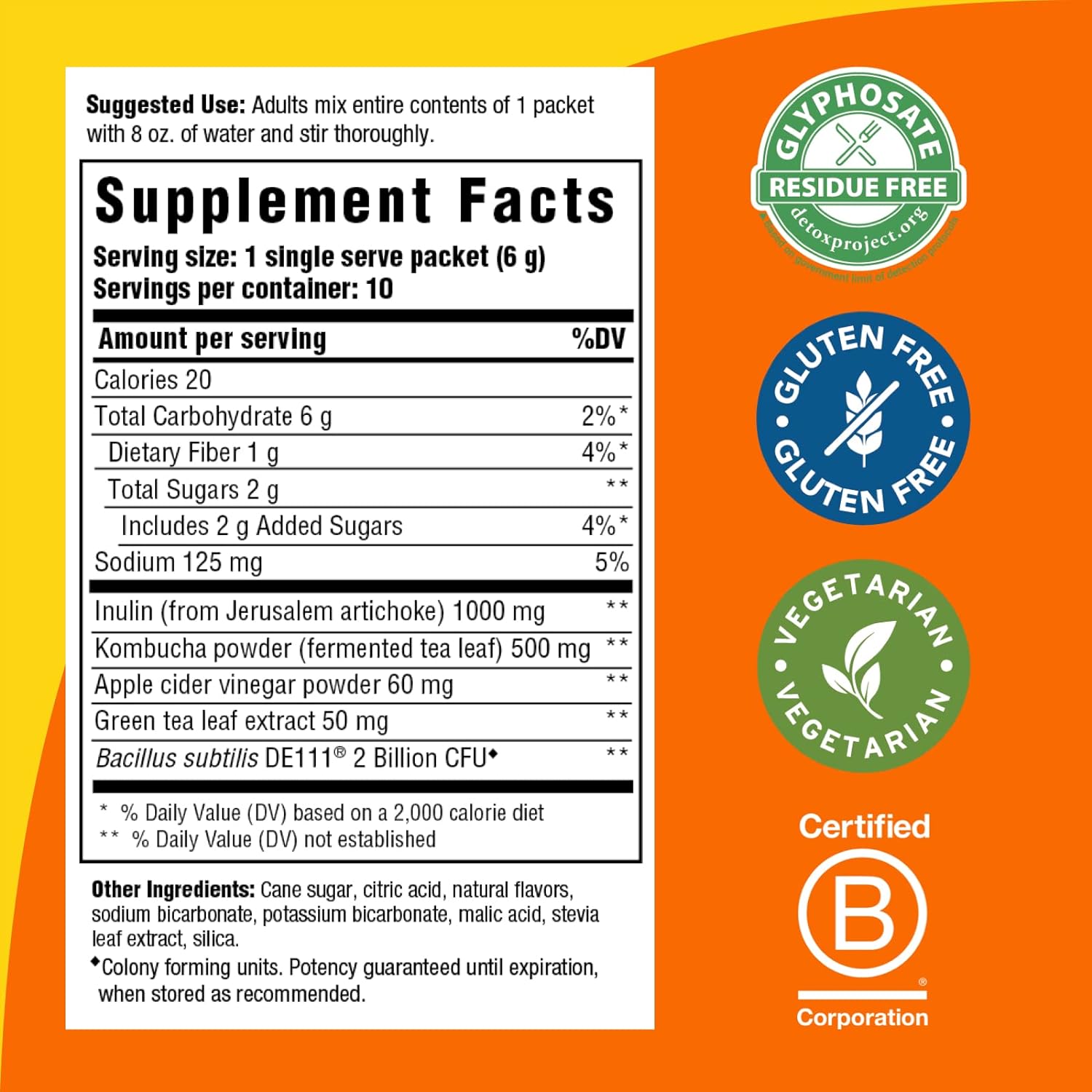 Inulin (from Jerusalem artichoke), Kombucha powder (fermented tea leaf), Apple cider vinegar powder, Green tea leaf extract, Probiotic Blend: MuniSporeTM Bacillus clausii CS108, Bacillus subtilis DE111®. Other Ingredients: Cane sugar, citric acid, natural flavors, sodium bicarbonate, potassium bicarbonate, malic acid, stevia leaf extract, silica.