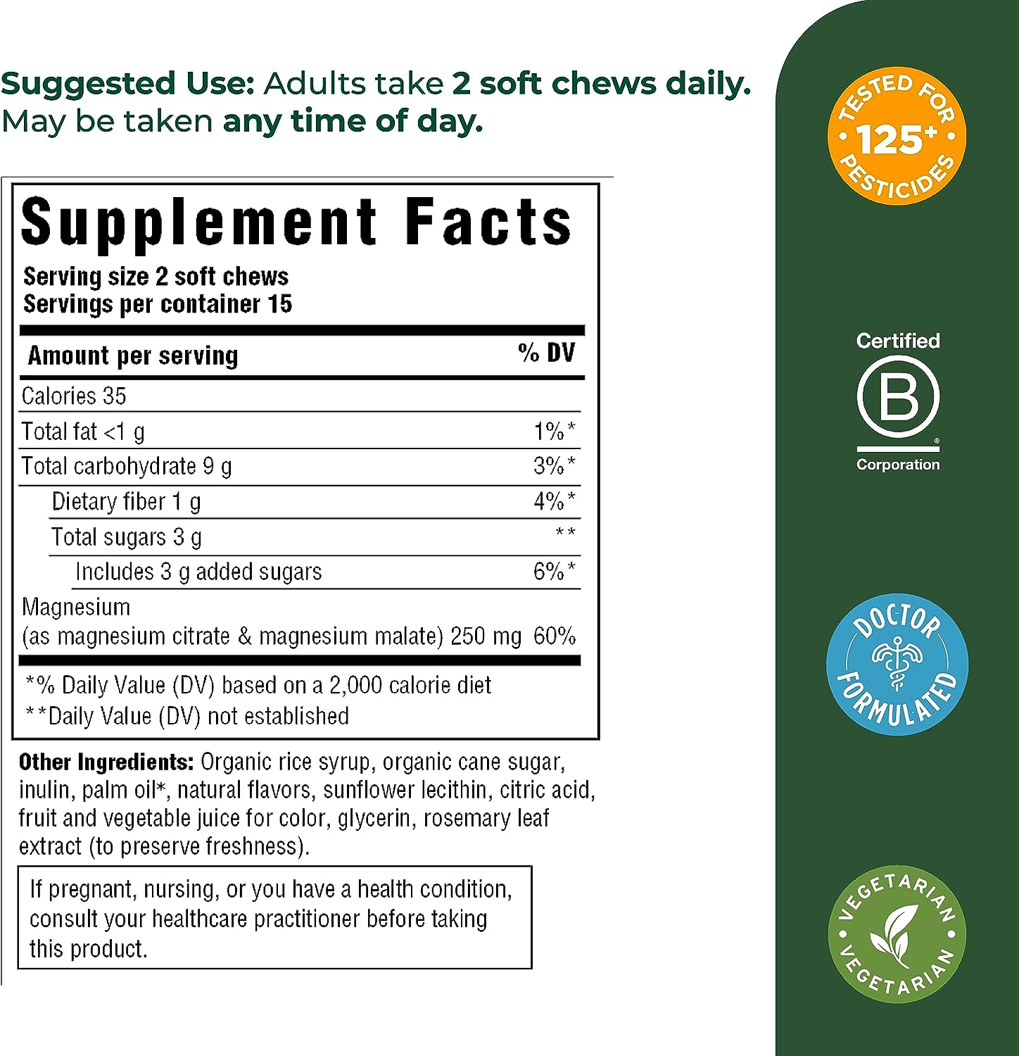 Magnesium (as magnesium citrate & magnesium malate) 250 mg. Other Ingredients: Organic rice syrup, organic cane sugar, inulin, palm oil, natural flavors, sunflower lecithin, citric acid, fruit and vegetable juice for color, glycerin, rosemary leaf extract (to preserve freshness).