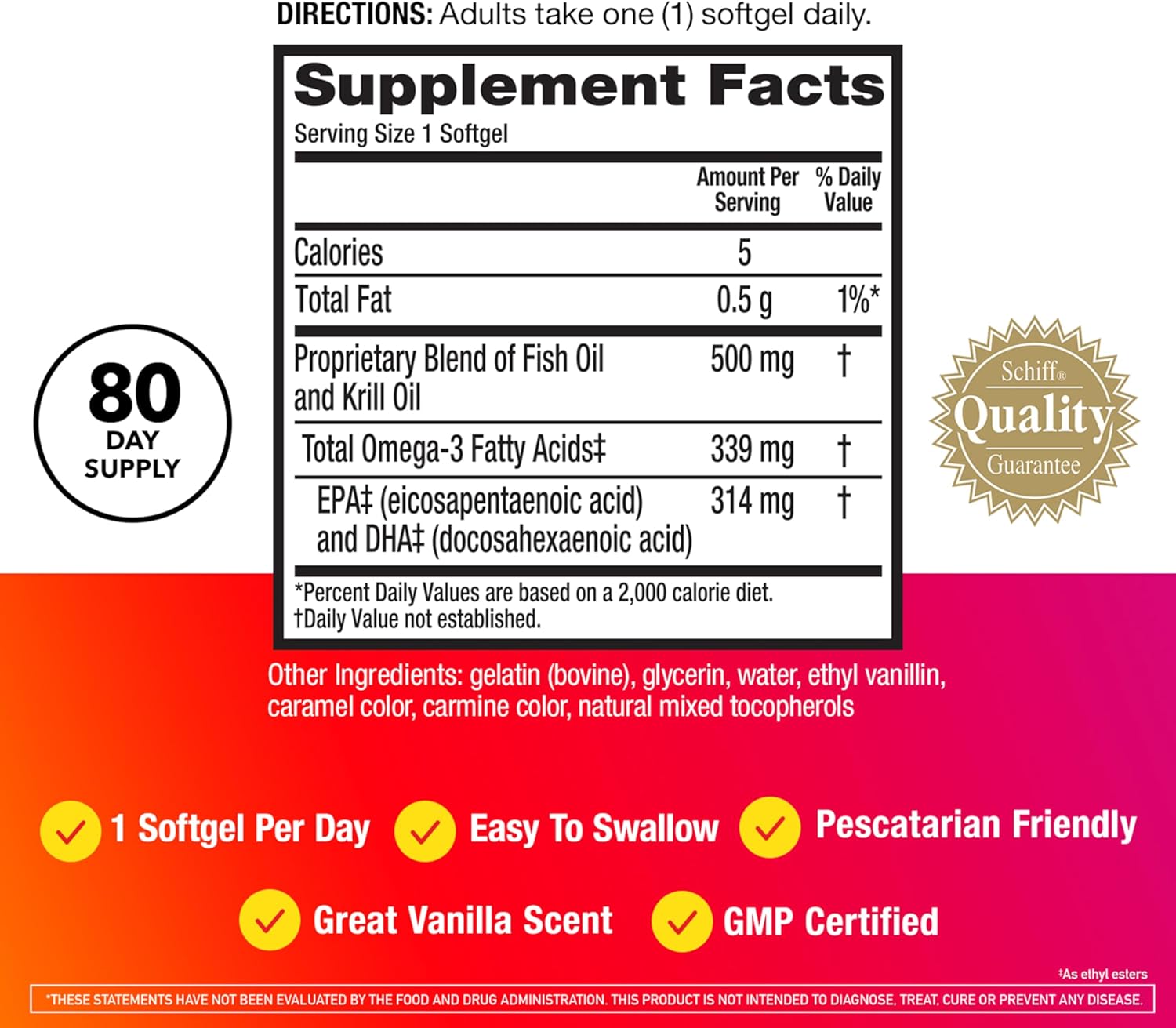 - FISH and KRILL OIL, BETTER TOGETHER: MegaRed Advanced 4-in-1 uses a special combination of high concentration fish oil and high absorption krill oil that has 2X more Omega 3s vs standard fish oil alone, and it supports heart, joint, brain, and eye health.