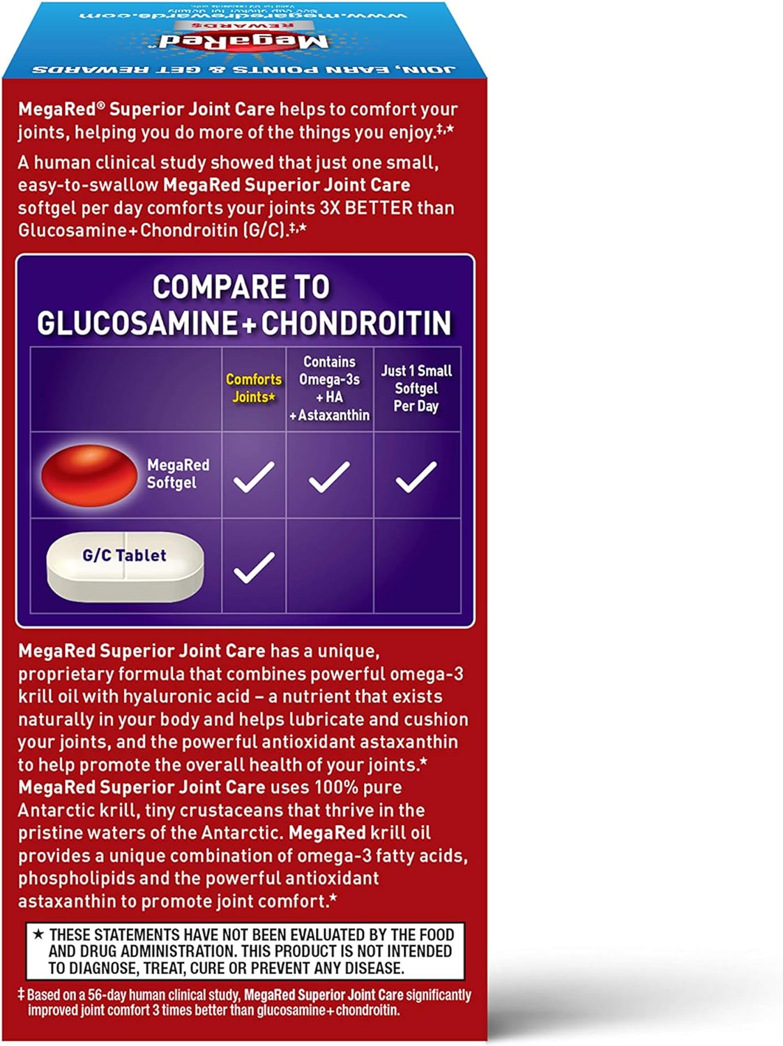 MegaRed Superior Joint Care Omega-3 Krill Oil has a unique proprietary formula that combines powerful Omega-3 krill oil with hyaluronic acid, a substance that exists naturally in your body and helps lubricate and cushion your joints, and the powerful antioxidant astaxanthin to help support the overall health of you joints.٭ ٭THESE STATEMENTS HAVE NOT BEEN EVALUATED BY THE FOOD AND DRUG ADMINISTRATION. THIS PRODUCT IS NOT INTENDED TO DIAGNOSE, TREAT, CURE OR PREVENT ANY DISEASE.