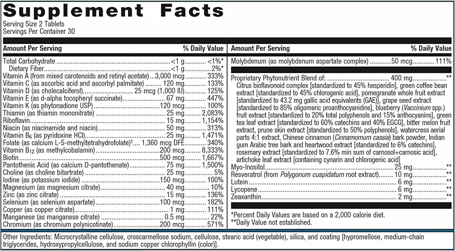 Vitamin A 3000mcg, Vitamin C 120mcg, Vitamin D 1000IU, Vitamin E 67mg, Vitamin K 120mcg, Thiamin 25mg, Riboflavin 15mg, Niacin 25mg, Vitamin B6 25mg, Folate 1360mcg DFE, Vitamin B12 200mcg, Biotin 500mcg, Pantothenic Acid 75mg, Choline 25mg, Iodine 150mcg, Magnesium 40mg, Zinc 15mg, Selenium 100mcg, Copper 1mg, Manganese 0.5mg, Chromium 200mcg, Molybdenum 50mcg, Proprietary Phytonutrient Blend of: Citrus bioflavonoid complex 400mg. Myo-Inositol 25mg, Resveratrol 10mg, Lutein 6mg, Lycopene 6mg, Zeaxanthin 2mg, Other Ingredients: Microcrystalline cellulose, croscarmellose sodium, cellulose, stearic acid (vegetable), silica, and coating [hypromellose, medium-chain triglycerides, hydroxypropylcellulose, and sodium copper chlorophyllin (color)].
