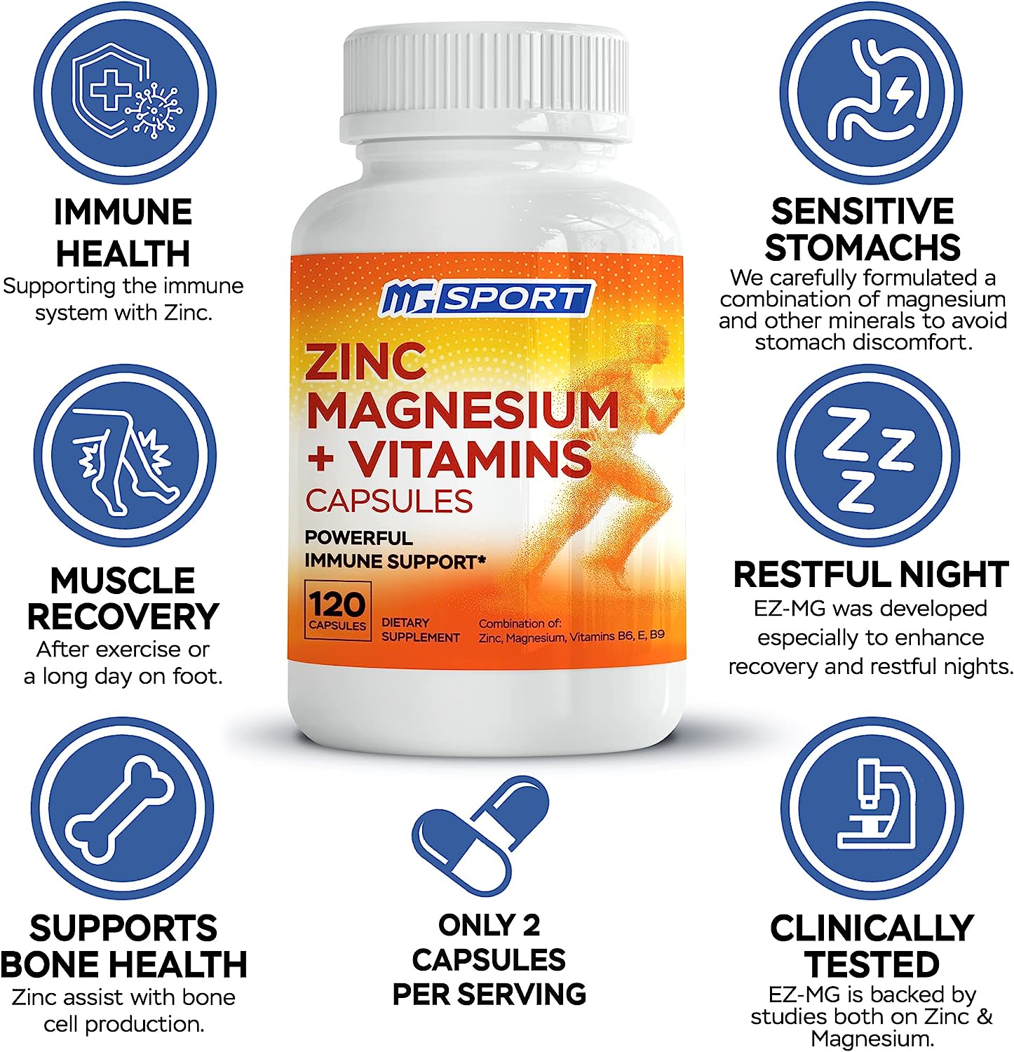 MgSport Magnesium and Zinc + Vitamins B6, B9, High Absorption 120 Capsules