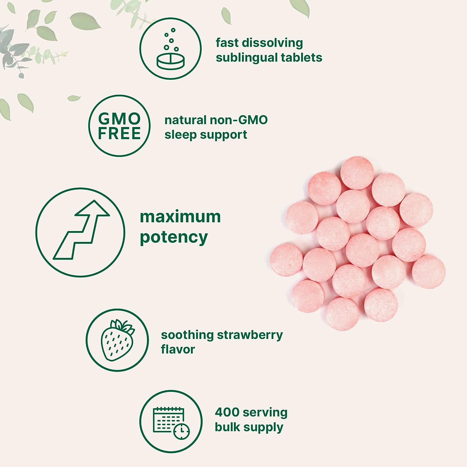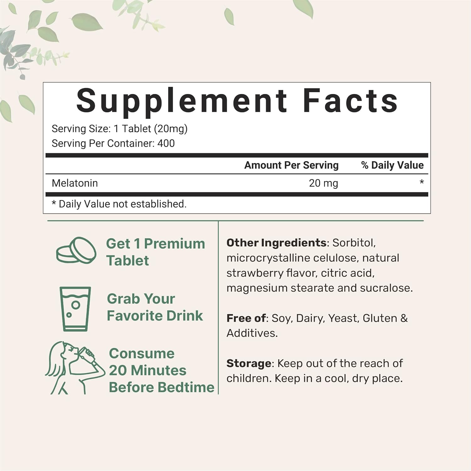 - A one a day potent 20mg formula that does not require any swallowing. It is created with non-habit forming and vegan friendly ingredients that offer a 400-serving melatonin bulk supply with every pouch.