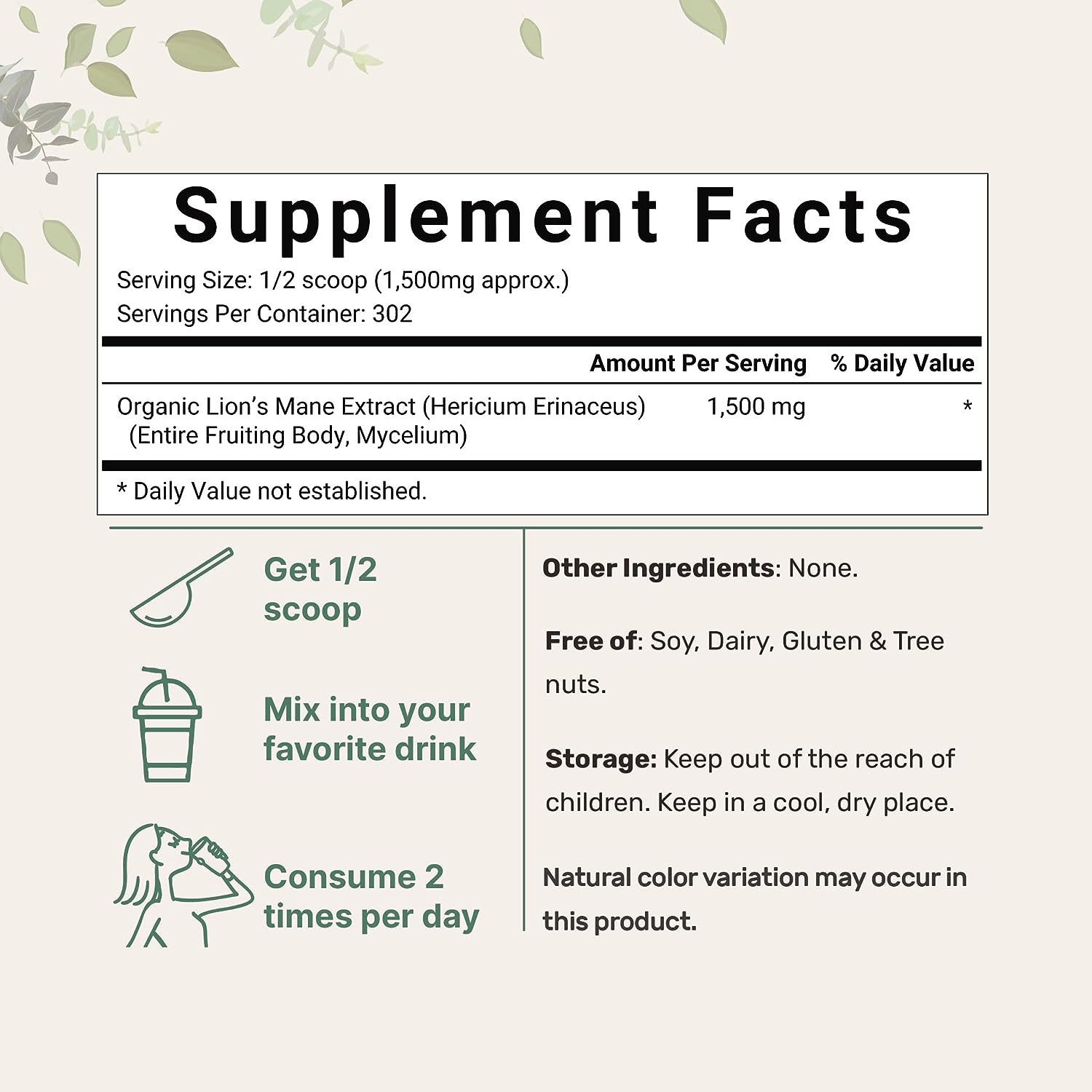 - Each pouch contains 16 ounces of fresh lion’s mane powder, ½ scoop serving size, provides 1,500mg organic lion’s mane from authentic hericium erinaceus, 302 total servings.