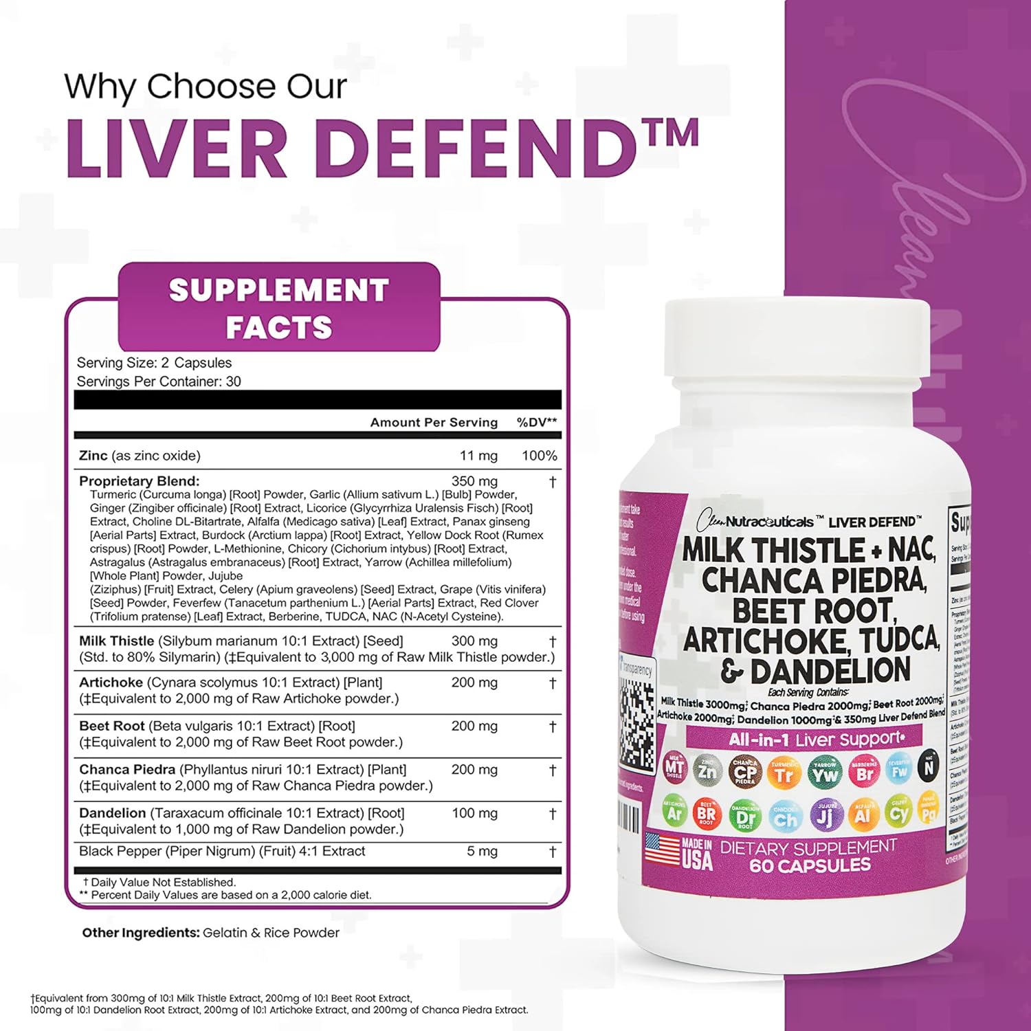 Milk Thistle (Silybum marianum 10:1 Extract) [Seed] (Std. to 80% Silymarin) 300mg (Equivalent to 3000mg of Raw Milk Thistle powder), Artichoke (Cynara scolymus 10:1 Extract) [Plant] 200mg (Equivalent to 2000mg of Raw Artichoke powder), Beet Root (Beta vulgaris 10:1 Extract) [Root] 200mg (Equivalent to 2000mg of Raw Beet Root Powder), Chanca Piedra (Phyllanthus niruri 10:1 Extract) [Plant] 200mg (Equivalent to 2000mg of Raw Chanca Piedra Powder), Dandelion (Taraxacum officinale 10:1 Extract) [Root] 100mg (Equivalent to 1000mg of Raw Dandelion Powder), Black Pepper (Piper nigrum) (Fruit) 4:1 Extract, Zinc (as Zinc Oxide) 11mg, Proprietary Blend: Turmeric (Curcuma longa) [Root] Powder, Garlic (Allium sativum L.) [Bulb] Powder, Ginger (Zingiber officinale) [Root] Extract, Licorice (Glycyrrhiza Uralensis Fisch) [Root] Extract, Choline DL-Bitartrate, Alfalfa (Medicago sativa) [Leaf] Extract, Panax Ginseng [Aerial Parts] Extract, Burdock (Arctium lappa) [Root] Extract, Yellow Dock Root (Rumex crispus) [Root] Powder, L-Methionine, Chicory (Cichorium intybus) [Root] Extract, Astragalus (Astragalus membranaceus) [Root] Extract, Yarrow (Achillea millefolium) [Whole Plant] Powder, Jujube (Ziziphus) [Fruit] Extract, Celery (Apium graveolens) [Seed] Extract, Grape (Vitis vinifera) [Seed] Powder, Feverfew (Tanacetum parthenium L.) [Aerial Parts] Extract, Red Clover (Trifolium pratense) [Leaf] Extract, Berberine, TUDCA, NAC (N-Acetyl Cysteine).