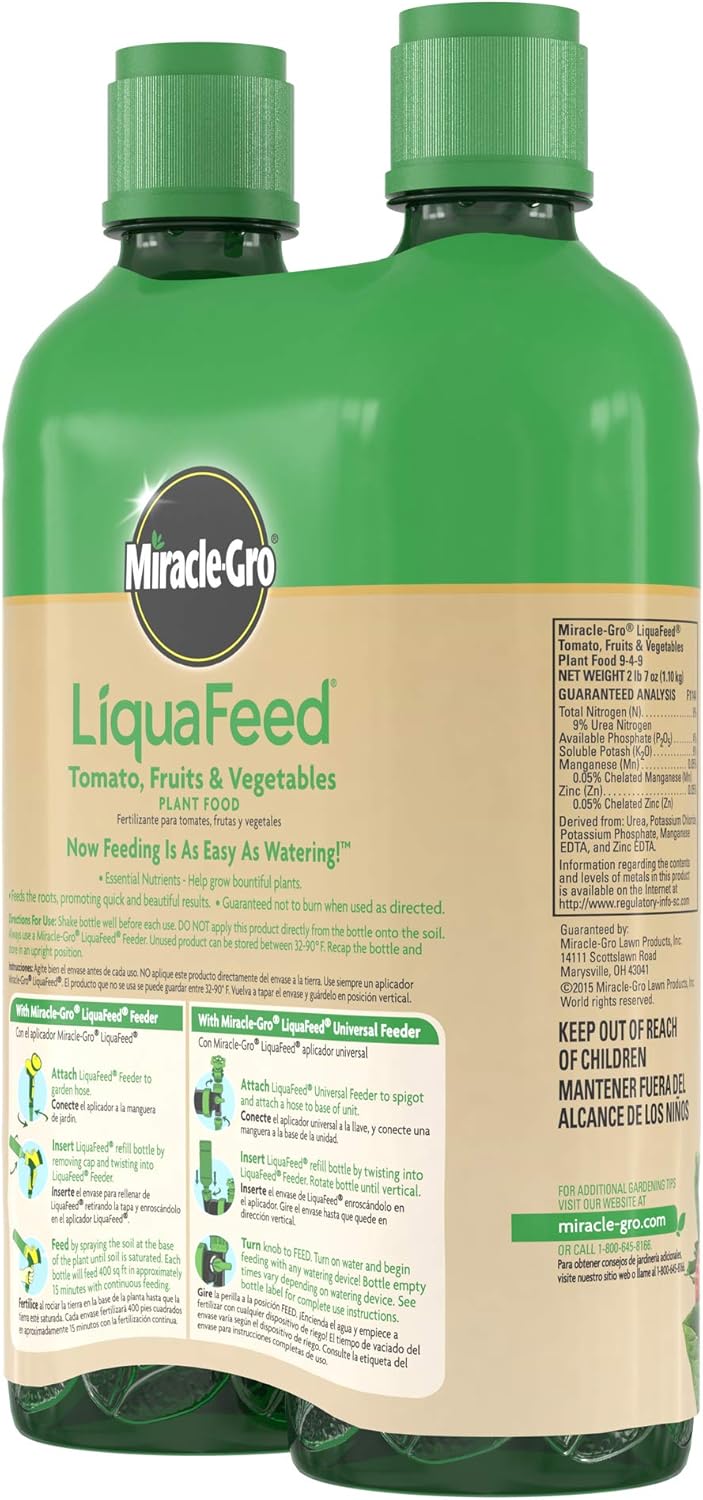 - This refill pack includes two 16 oz. bottles of Miracle-Gro LiquaFeed Tomato, Fruits and Vegetables Plant Food; each bottle feeds up to 400 sq. ft. of garden