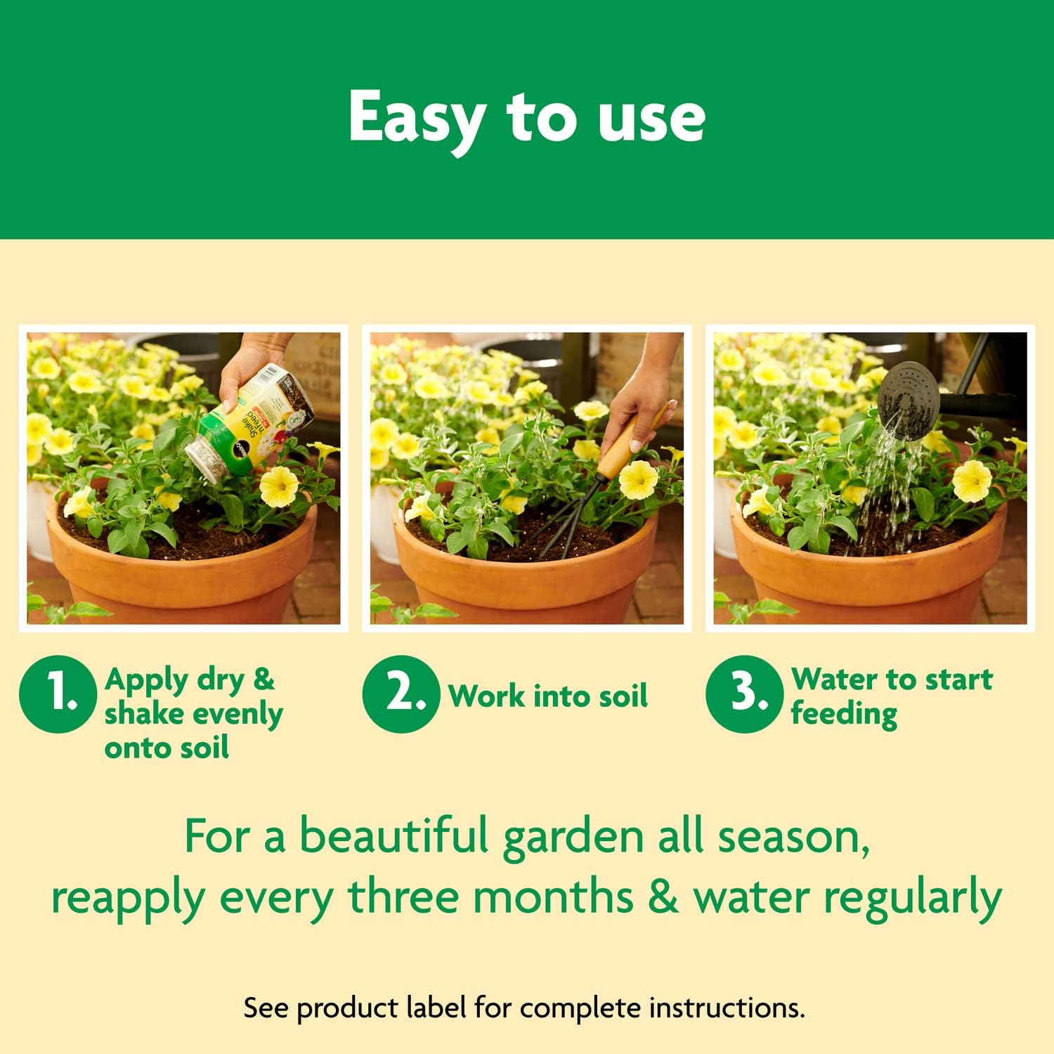 - Reapply Miracle-Gro Shake 'N Feed All Purpose Plant Food every 3 months and water regularly for a beautiful garden all season long