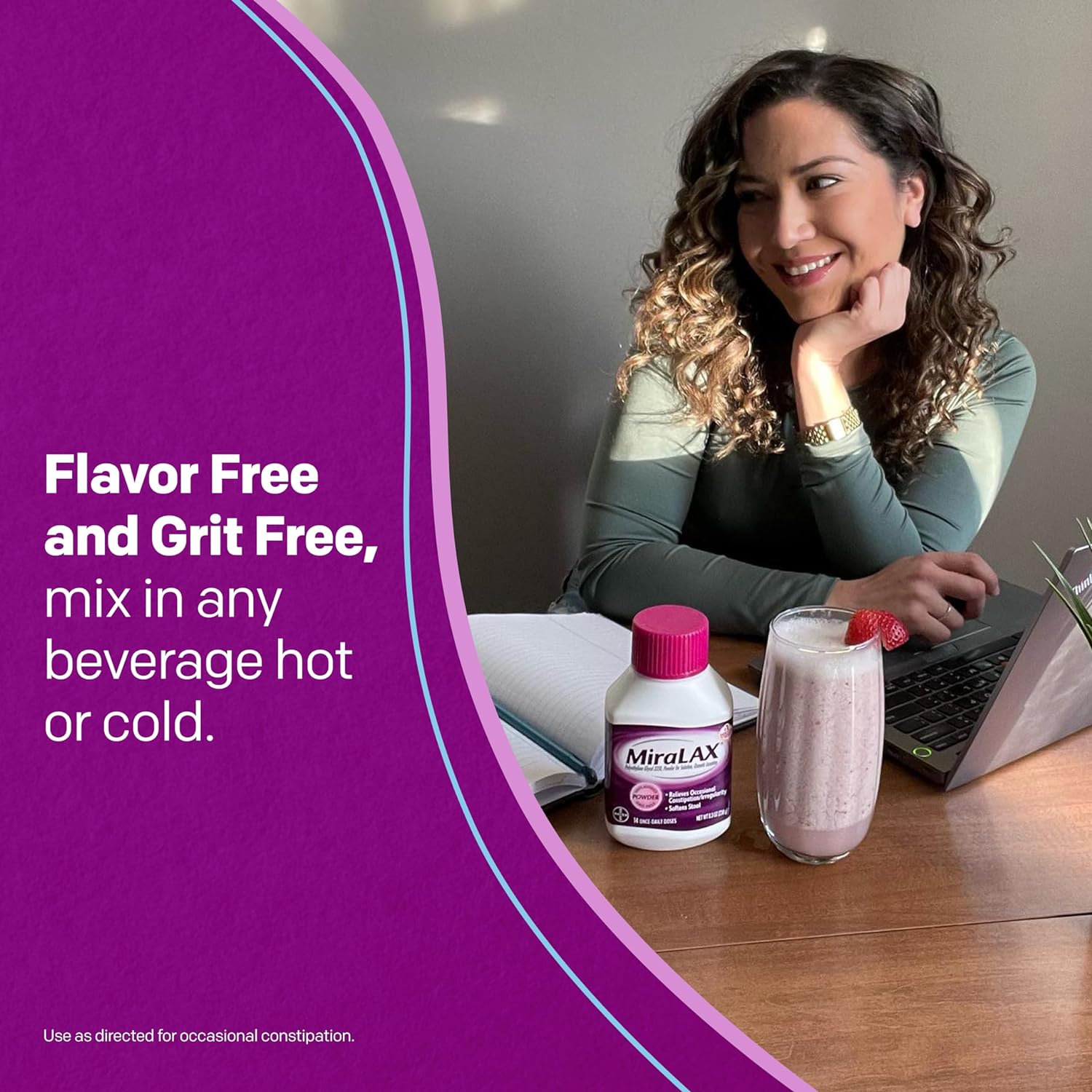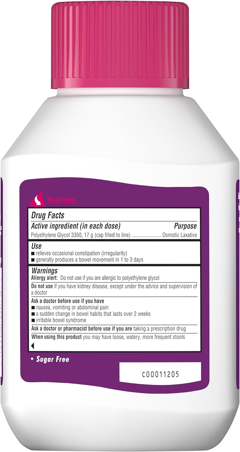 MiraLAX is a polyethylene glycol (PEG 3350) laxative powder made for providing gentle constipation relief. Unlike some laxatives which stimulate the nerves, MiraLAX is a non stimulant osmotic laxative, working naturally with the water in your body to hydrate, soften, and ease stool through the colon gently. Since 2007, MiraLAX has been the #1 Physician Recommended OTC brand of laxative. It relieves occasional constipation without causing harsh side effects like cramping, bloating, sudden urgency, and gas. MiraLAX is a gentle laxative designed to relieve occasional constipation and presents no risk of product dependence. Constipation can be caused by lifestyle factors such as stress, diet, travel, medications, and lack of exercise. It can be defined by fewer than normal bowel movements, difficulty passing stool and abdominal bloating. To use, fill bottle cap to the indicated line (white section in cap) and pour into 4 to 8 ounces of hot or cold beverage including but not limited to coffee, tea, juice, milk and more. Stir with stirrer until powder is fully dissolved, then drink. MiraLAX has no added taste or grit and generally produces a bowel movement in 1-3 days.
