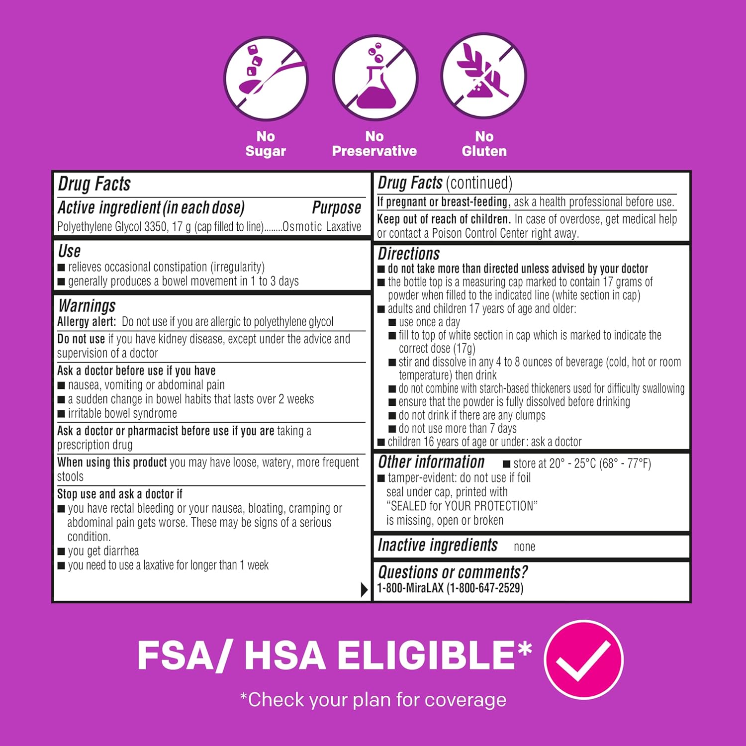 - NO HARSH SIDE EFFECTS: MiraLAX helps relieve your occasional constipation without causing gas, bloating, cramping, or sudden urgency