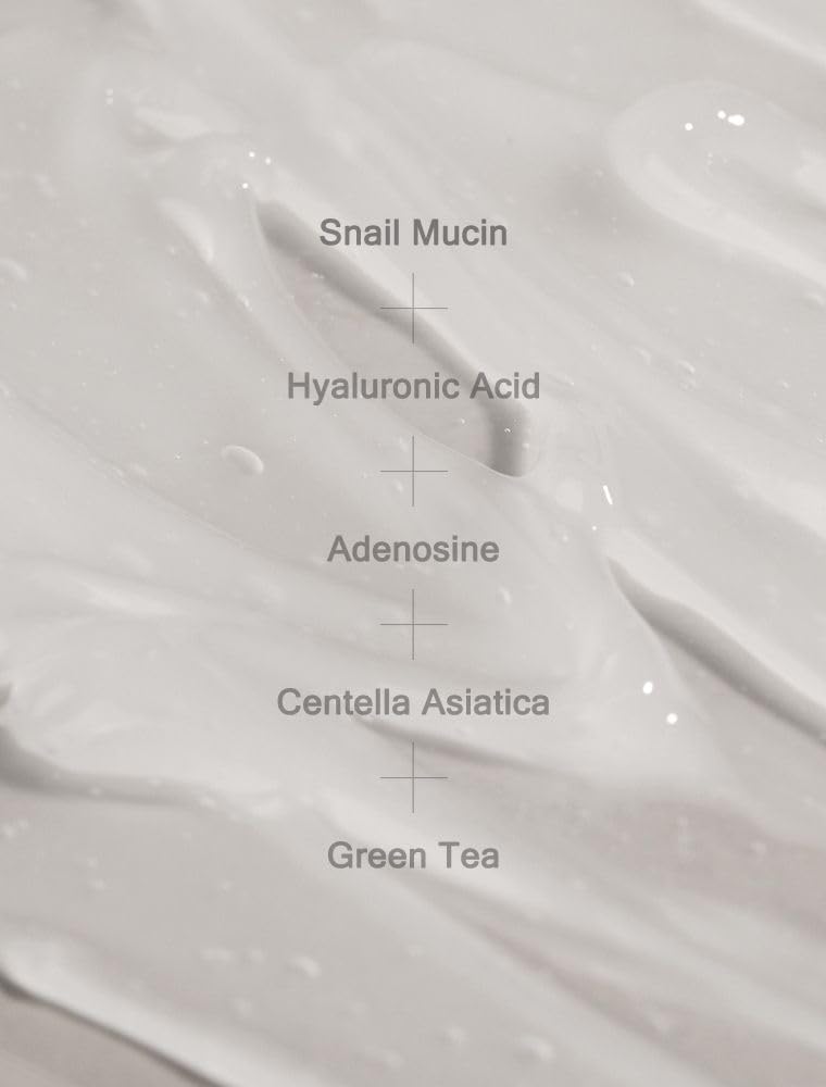 Water, Bytulene Glycol, Cyclopentasiloxane, Glycerin, Bis-PEG-18 Methyl Ether Dimethyl Silane, Snail Secreation Filtrate, Cyclohexasiloxane, Hydroxyacetophenone, Glycosyl Trehalose, Phenoxyethanol, Carbomer, Triethanolamine, Hydroxyethylcellulose, Polysorbate 20, Hydrogenated Starch Hydrolysate, Dimethicone/Vinyl Dimethicone Crosspolymer, Dimetichone, Niacinamide, Ethylhexylglycerin, Adenosine, Leontopodium Alpinum Callus Culture Extract, Allantoin, Panthenol, Disodium EDTA, 1-2Hexanediol, Helianthus Annuus (Sunflower) Seed Oil, Olea Europaea (Olive) Fruit Oil, Camellia Sinensis Leaf Extract, Betula Alba Juice, Sodium Polyacrylate, Sodium Hyaluronate, BHT, Nelumbo Nucifera Root Extract, Melaleuca Alternifolia (Tea Tree) Leaf Exrract, Centella Asiatica Extract, Caffeine, Helichrysum Italicum Extract, Copper Tripeptide-1, Acetyl Hexapeptide-8, Palmitoyl Pentapeptide-4, Palmitoyl Tripeptide-1, Palmitoyl Tetrapeptide-7, Tripeptide-1, Tripeptide-2, Tripeptide-3, Acetyl Octapeptide-3