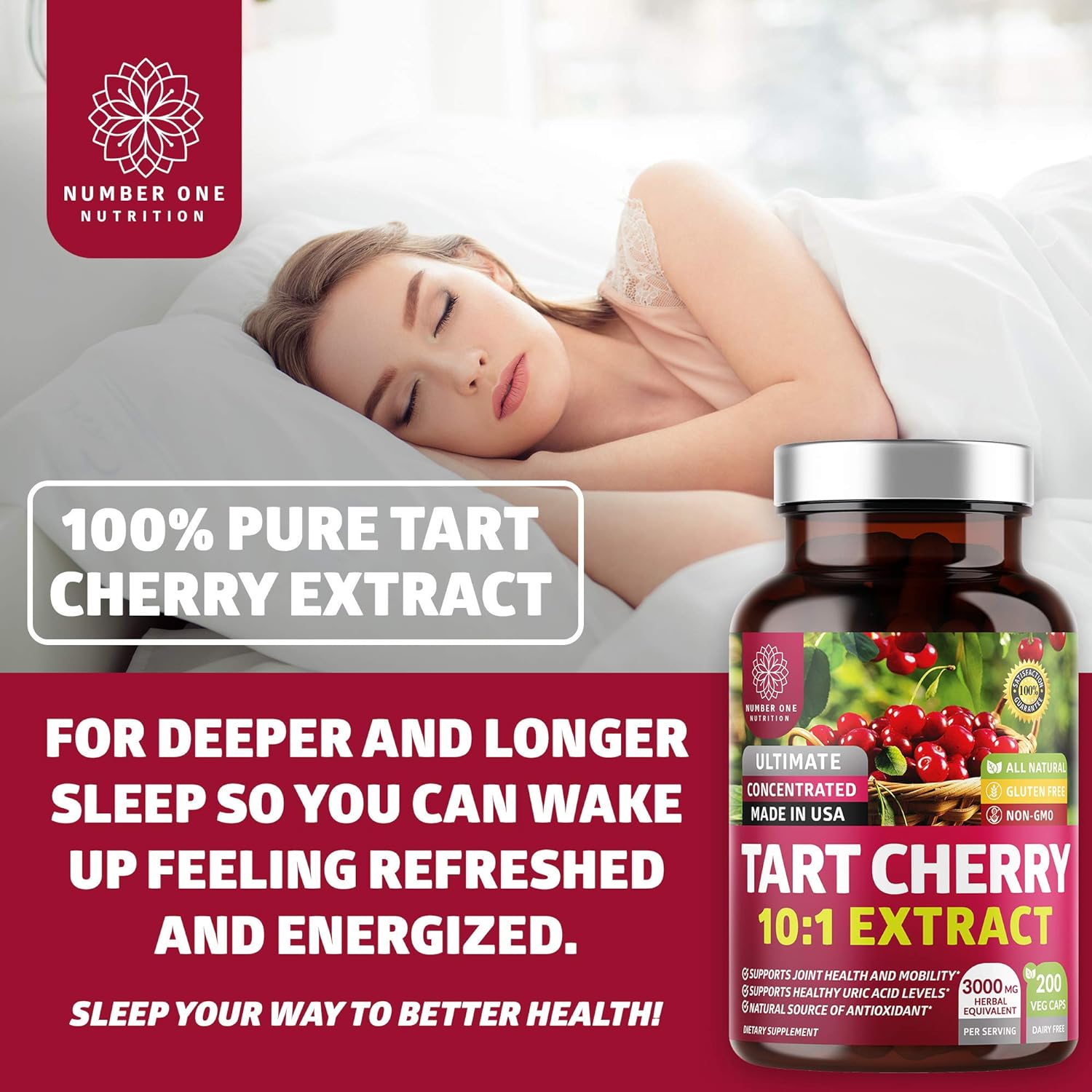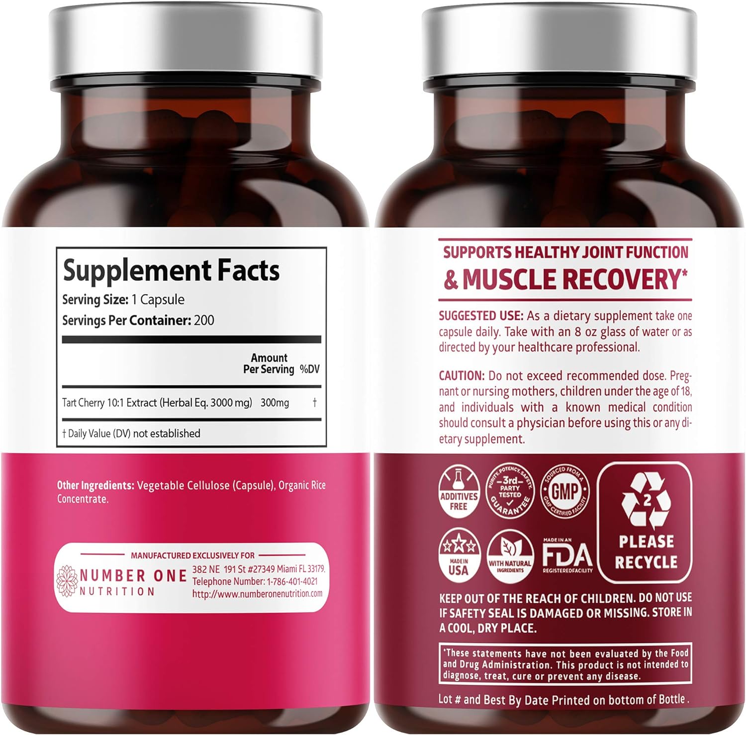 SUPERIOR NATURAL BLEND. N1 Nutrition's Tart Cherry Supplement boasts a powerful and concentrated 10:1 Tart Cherry extract for a total of 3000mg per serving to give you the highest bioavailability and absorption rate. It is loaded with nutrients, minerals, flavonoids and anti-inflammatory properties for superior wellness. PACKED WITH POWERFUL ANTIOXIDANTS to help fight free radicals, stress and prevent infections. It also helps strengthen your immunity and boost your natural defenses all year round. SOOTHES JOINT PAINS AND BOOSTS MUSCLE RECOVERY to help restore your body quickly so you can always perform at your best. It also helps relieve the symptoms of gout, including joint pain, swelling and inflammation. EXPERIENCE DEEP AND RESTFUL SLEEP so you wake up feeling refreshed and energized. It contains tryptophans and anthocyanins that help increase levels of melatonin to improve sleep quality and duration. PROMOTES HEALTHY URIC ACID LEVELS by balancing and flushing out excess uric acid to promote healthy kidney function for optimum health & wellness. It is made from natural whole fruit in the USA in a registered facility that adopts GMP to ensure quality & potency. Be at the top of your game and start your path to wellness only with Number One Nutrition. Get yours today!