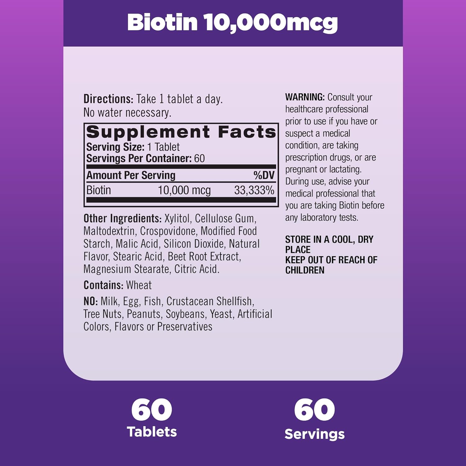 Healthy hair, skin, and nails for those low in Biotin and energy support supplement: Contains one 60 count bottle of Natrol Beauty Biotin 10000mcg Tablets for a 60-day supply