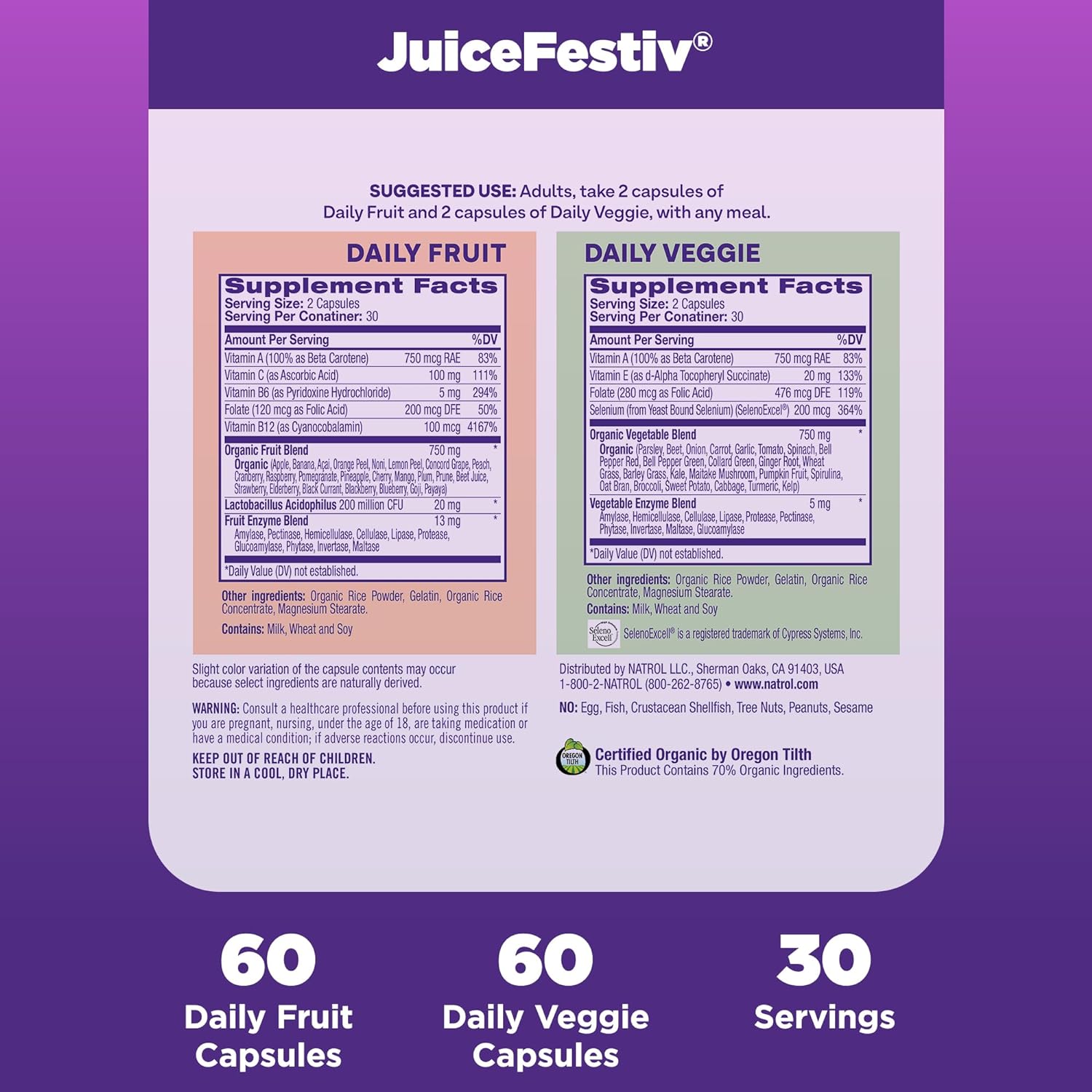 - Nutritional support supplement: Contains two 60 count bottles of Natrol JuiceFestiv Daily Fruit and Veggie Capsules for a 30-day supply
