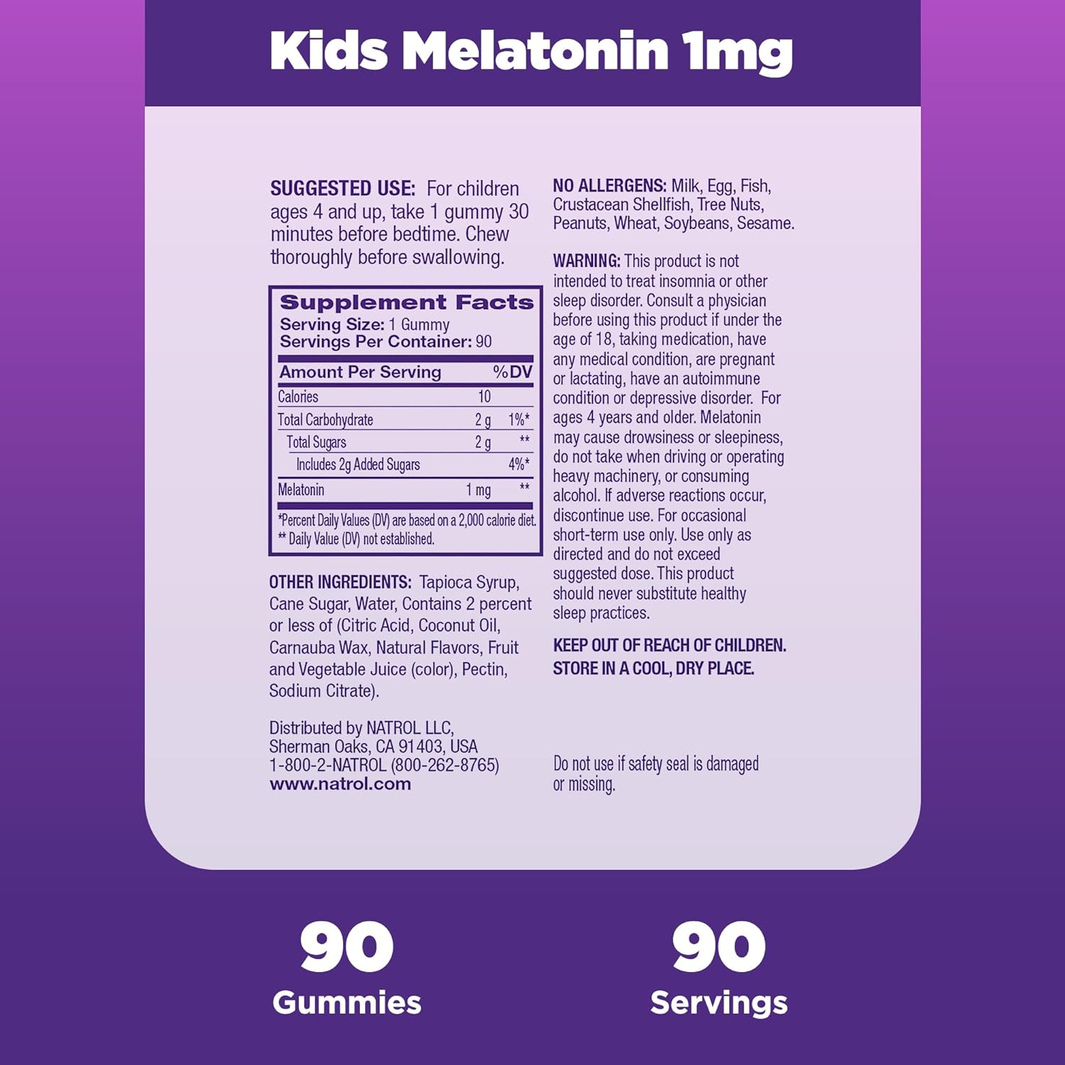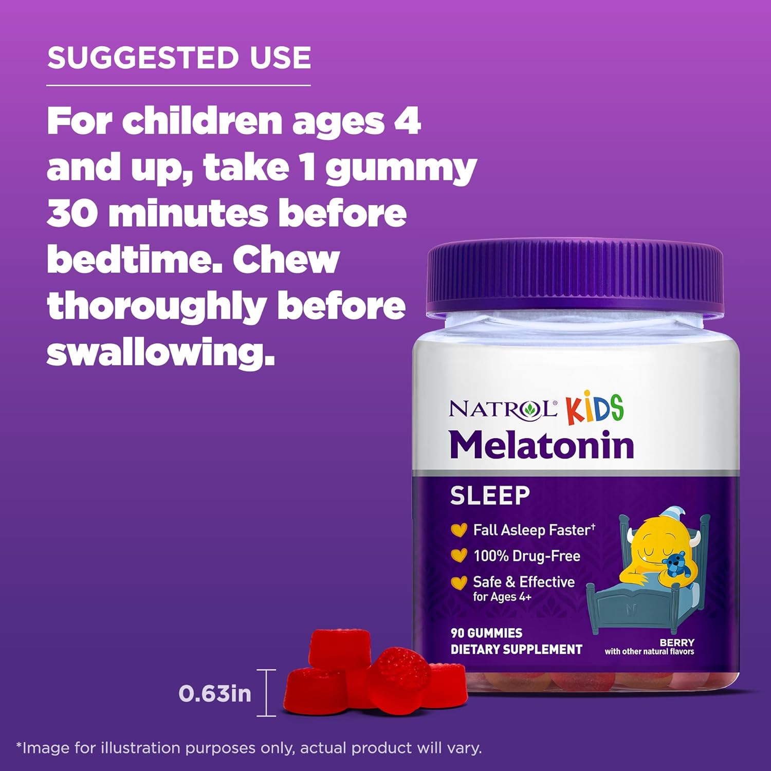 - Sleep Support Supplement: Contains one 90 count bottle of Natrol Kids Melatonin 1mg berry flavored gummies for a 90-day supply