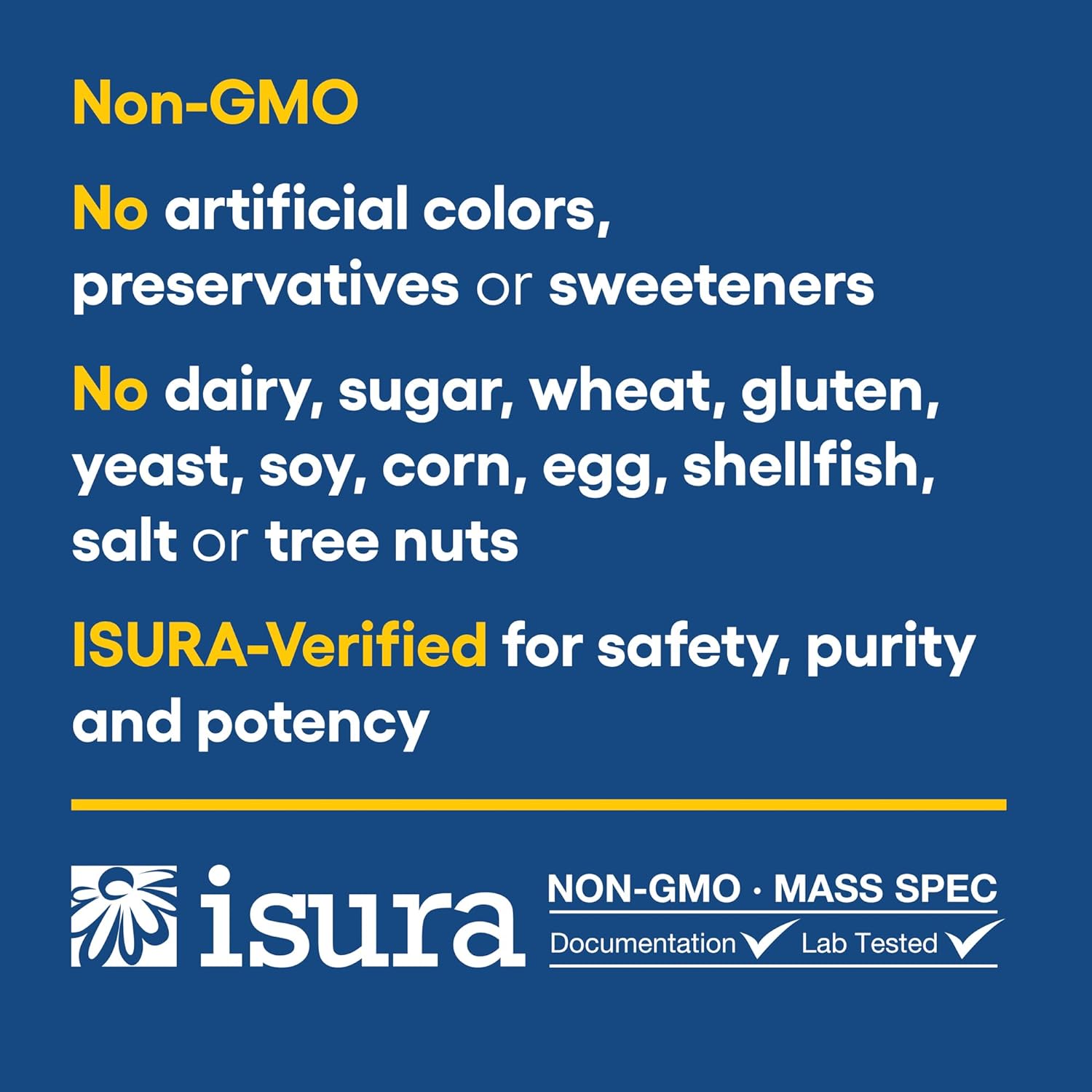 - Third-party certified and independently tested for GMOs and over 800 contaminants using advanced technology such as mass spectrometry to ensure purity and potency.