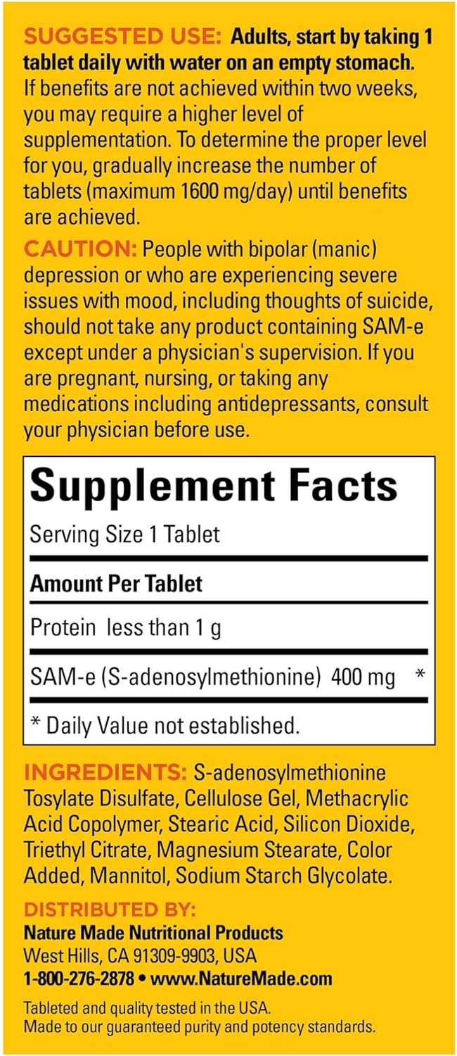 Nature Made SAM-e Complete(1) 400 mg Tablets are dietary supplements that naturally(2) help support a positive mood in as little as 7 to 14 days when taken daily. Sourced from high-quality ingredients, these SAMe 400mg mood support supplements are gluten free and contain no artificial flavors and no preservatives. SAM-e (S-adenosylmethionine) is a naturally occurring molecule produced by the body that can run low due to various factors such as a poor diet and aging. These Nature Made SAM-e Complete mood supplements also act as joint health supplements, providing a source of sulfur which is a critical component of joint tissue to help support joint comfort. These SAM-e supplements are a great choice for adults who are looking to replenish their SAM-e levels. Adults, start by taking one SAM e supplement tablet daily with water on an empty stomach. Nature Made supplements are quality you can trust. (1)Complete because studies have shown that SAM-e helps support a positive mood & joint comfort. (2)Provides SAM-e which is produced and used by the body. *Based on a survey of pharmacists who recommend branded vitamins and supplements.