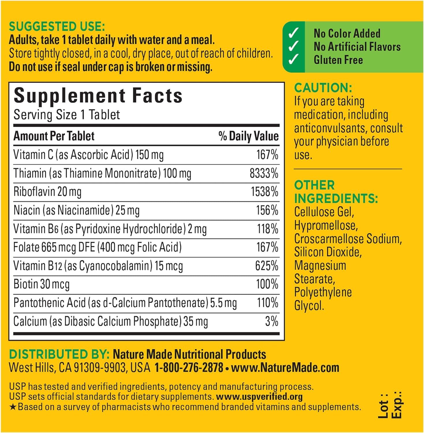Nature Made Super B Complex with Vitamin C and Folic Acid helps support the immune system and offers a combination of 8 essential B vitamins that support energy metabolism(1). Sourced from high-quality ingredients, these Nature Made Vitamin B complex tablets are a gluten free dietary supplement with no color added and no artificial flavors. This Nature Made Super B Complex provides all 8 essential B vitamins: thiamin (B1), riboflavin (B2), niacin (B3), pantothenic acid (B5), B6 (pyridoxine), biotin (B7), folic acid (B9), and B12 (cyanocobalamin). These Nature Made super B-complex with Vitamin C supplements also provide support for a healthy brain and nervous system. Adults take one of these Vitamin B complex supplements daily with water and a meal. Nature Made supplements are quality you can trust. USP has tested and verified ingredients, potency and manufacturing process. USP sets official standards for dietary supplements. Visit the USP verified website for more information. (1)Helps convert food into cellular energy. *Based on a survey of pharmacists who recommend branded vitamins and supplements.