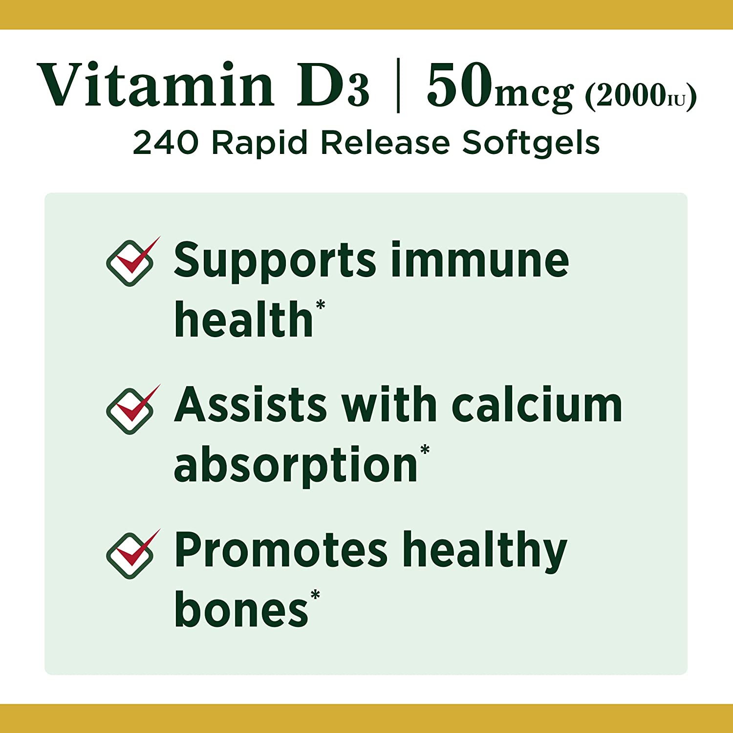 - STRONG, HEALTHY BONES: In addition to immune support, getting a sufficient amount of Vitamin D is critical to building and maintaining strong bones in adults. It is essential for calcium absorption to help support healthy bones. Nature’s Bounty Vitamin D3 Softgels supplement the Vitamin D your body needs for overall health