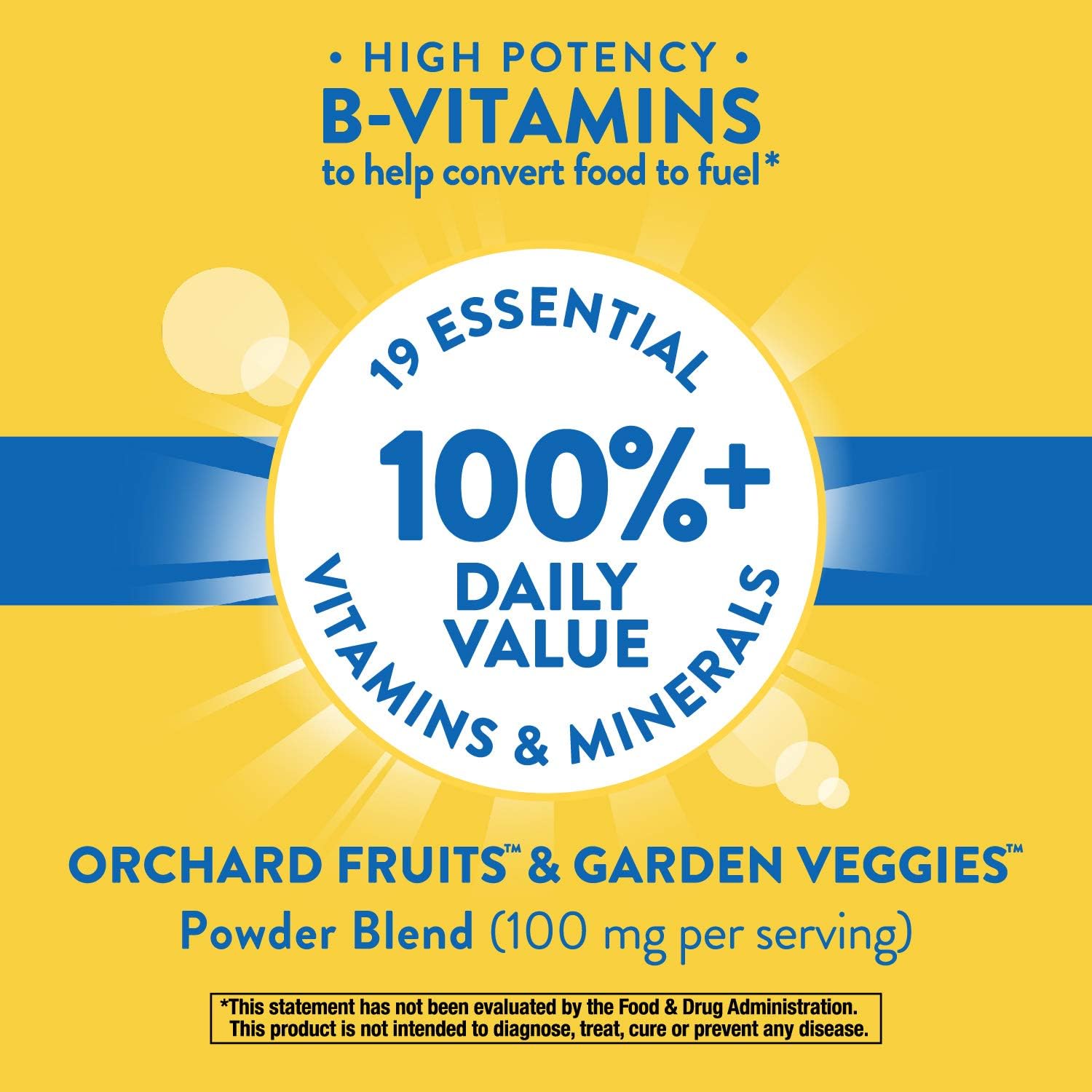 - Contains food-based Orchard Fruits & Garden Veggies powder blend (100 mg per serving).