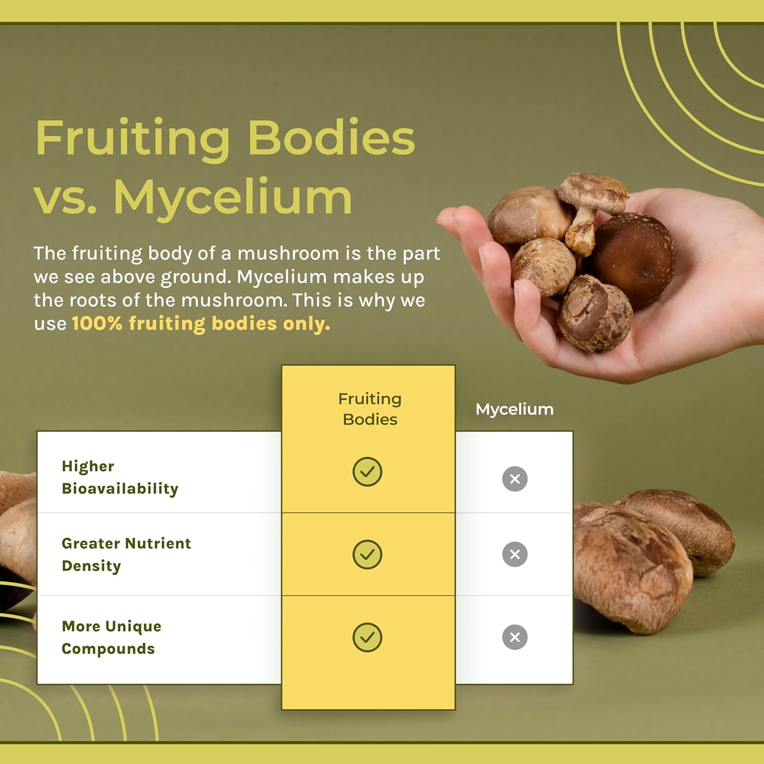 - 100% MUSHROOM FRUITING BODIES: Cordyceps Powder contains only whole fruiting bodies instead of mycelium and substrate, which are full of useless starchy fillers. Our hot water process breaks down mushrooms’ cell walls using ultra-purified water to optimize beneficial compounds' bioavailability. This process yields nutrient-dense mushroom powders with micro and macronutrient profiles for your wellness and dietary health. This includes more protein and higher beta-glucan and antioxidant content.