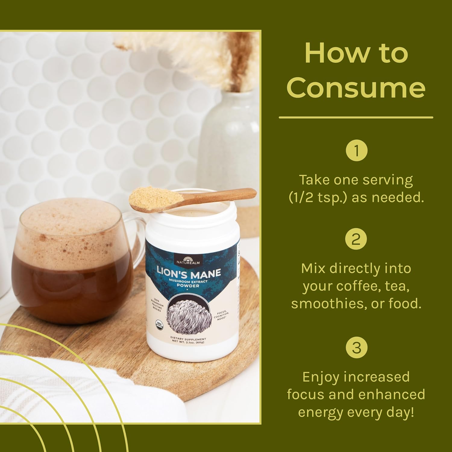 - OTHER FORMS OF ORGANIC LION’S MANE: Adding 1 teaspoon of Lion's Mane Powder to your coffee, tea, smoothie, or food is only one way to add brain, nerve, and immune health benefits to your daily routine. Naturealm also offers a Lion's Mane Mushroom Tincture to add to your beverage of choice or take sublingually under your tongue and Lion's Mane Capsules, which Naturealm suggests adults take 3 of per day.