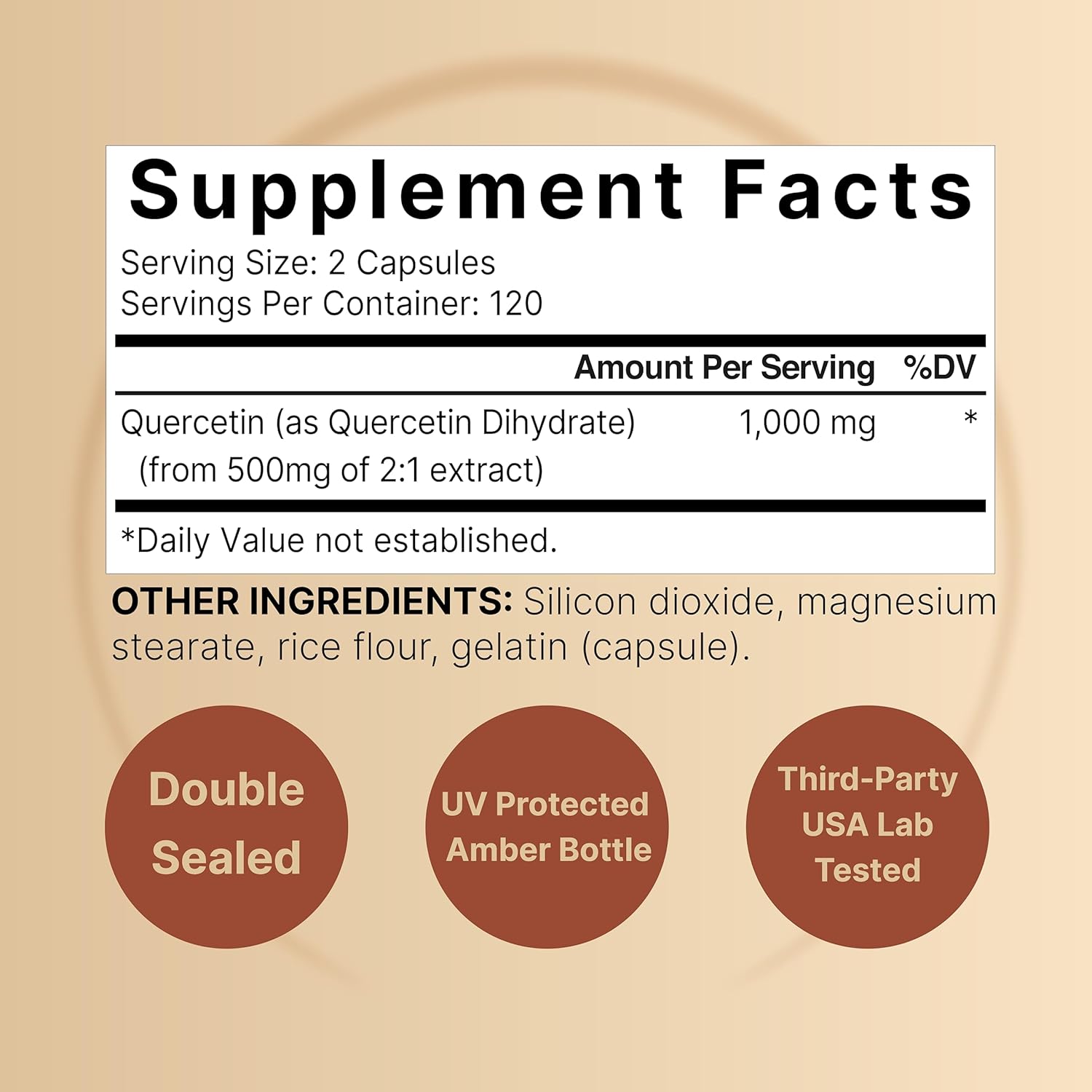 Authentic non-GMO quercetin powder capsuled supplements. Contains pure ingredients free of soy, dairy, gluten, preservatives, wheat, and tree nuts. Product is produced in California and 3rd party lab tested for safety and potency.