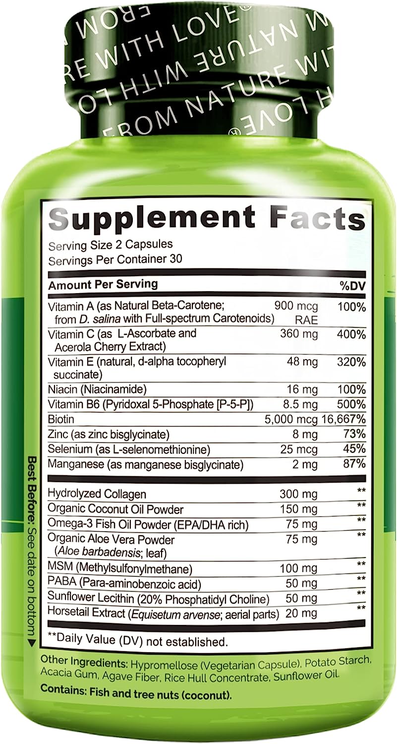 - Anti-Aging Ingredients: Contains 300 mg Collagen, a protein that provides structure and strength to hair, skin, and nails. Plus 5000 mcg Biotin, a B Vitamin that helps the body make the structural protein called keratin.