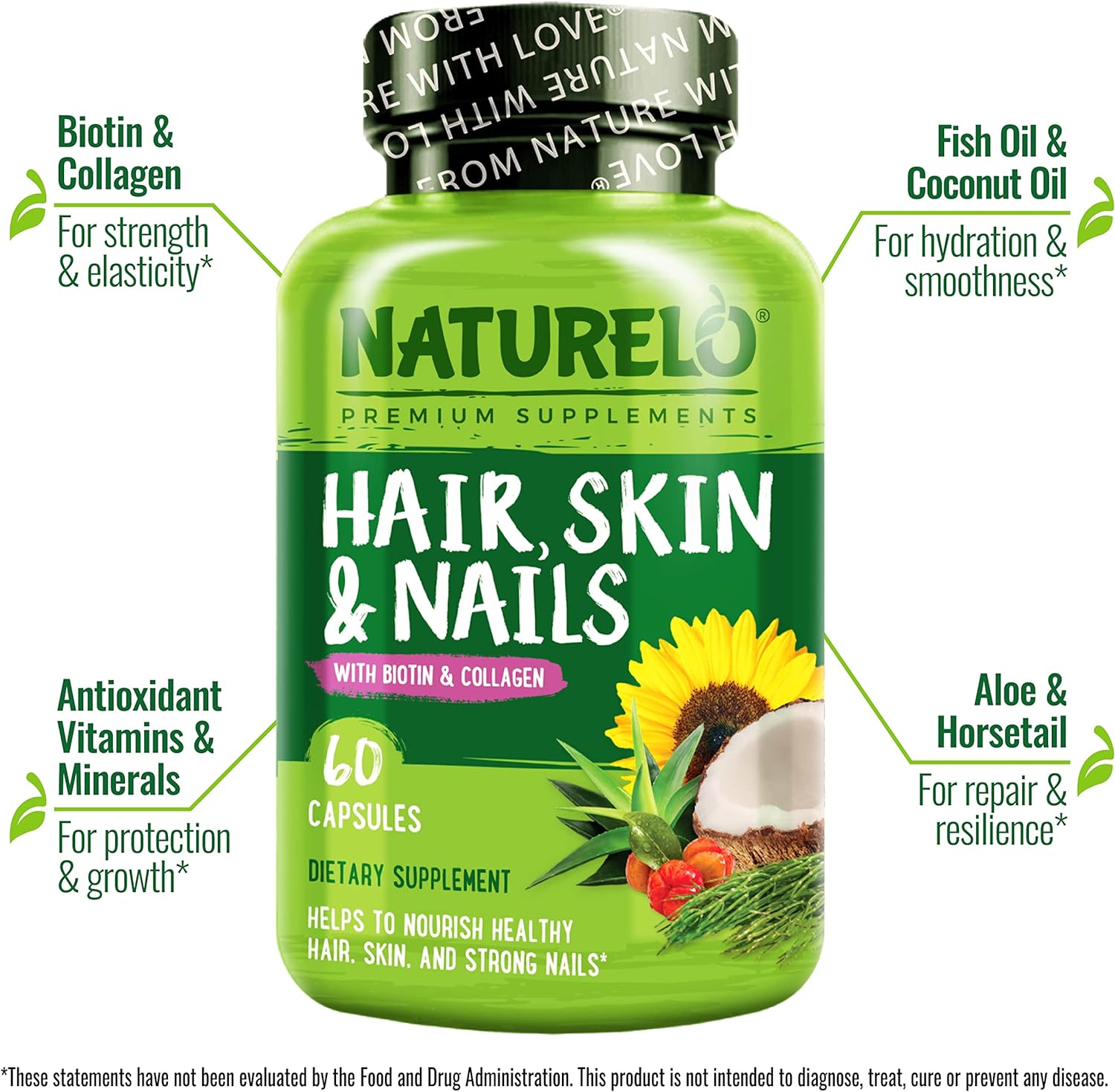 NATURELO Hair, Skin and Nails Vitamins - 5000 mcg Biotin, 60 capsules